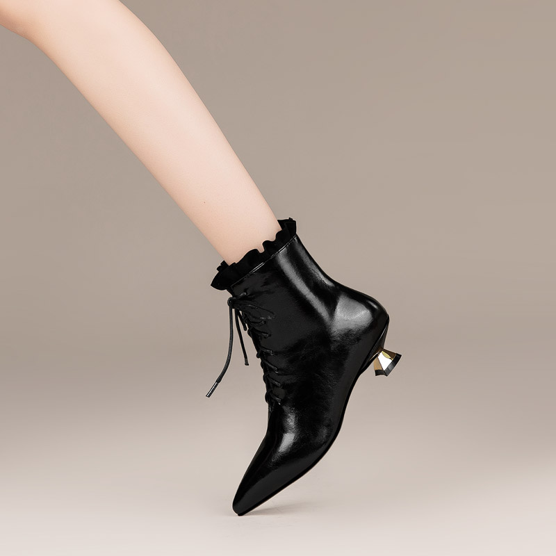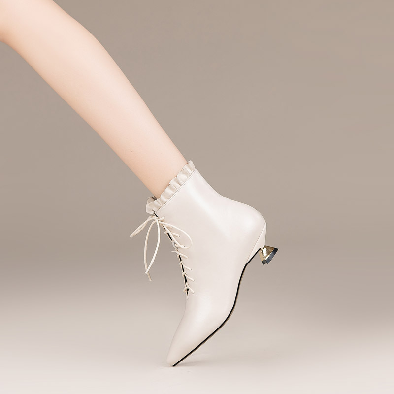 2025秋冬新款真皮尖头猫跟中筒靴子白色系带马丁靴高跟短靴瘦瘦靴