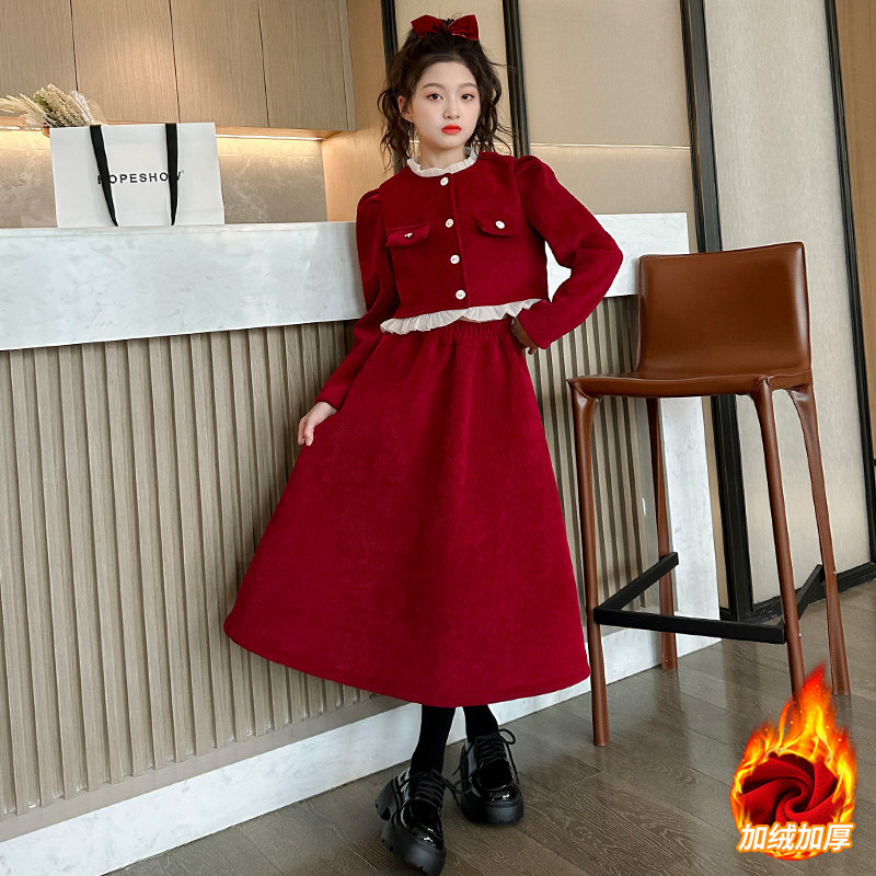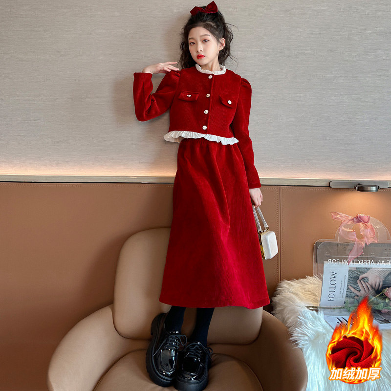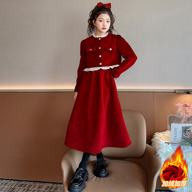 女童连衣裙秋冬款中大童女孩过年衣服小香风加绒加厚外套裙子套装