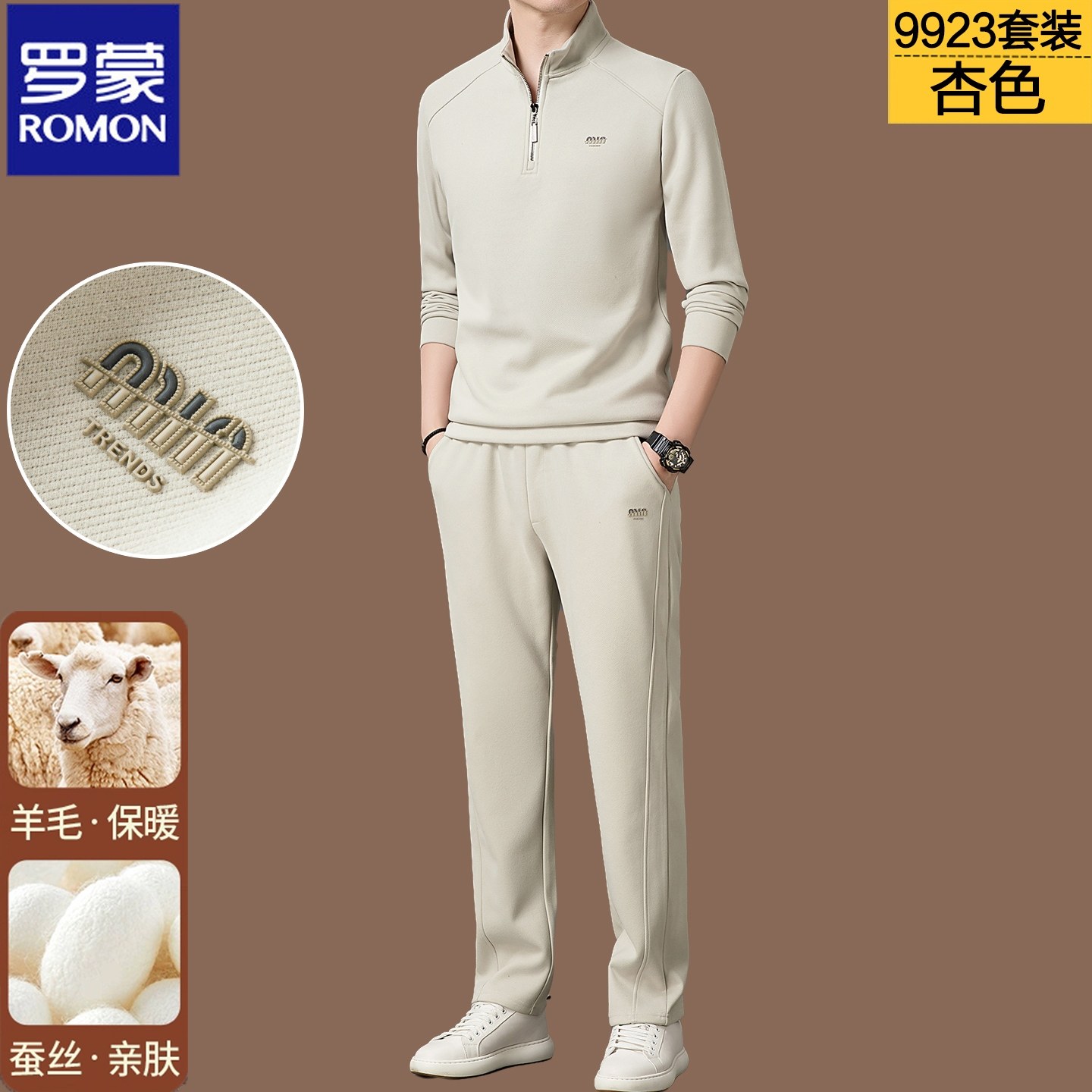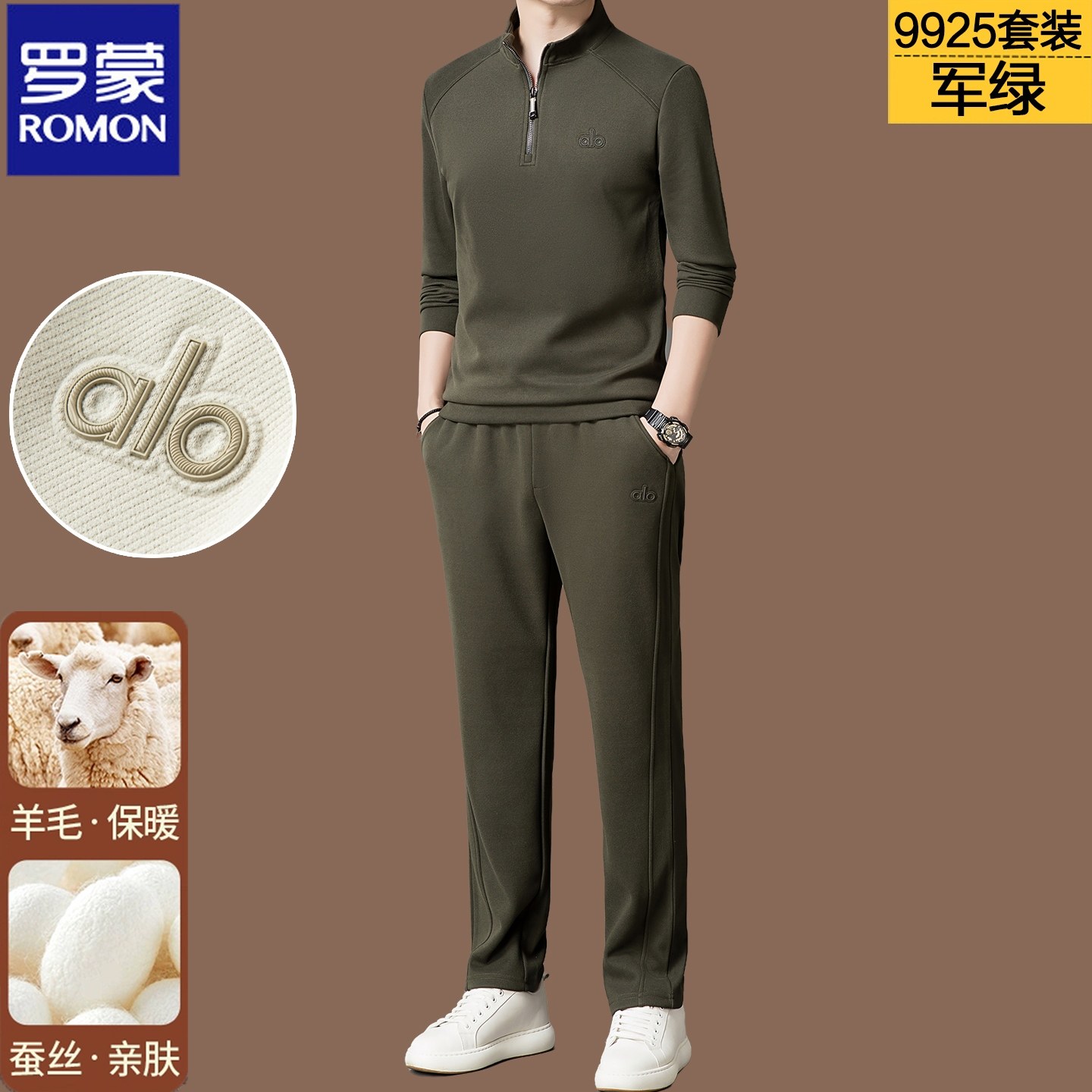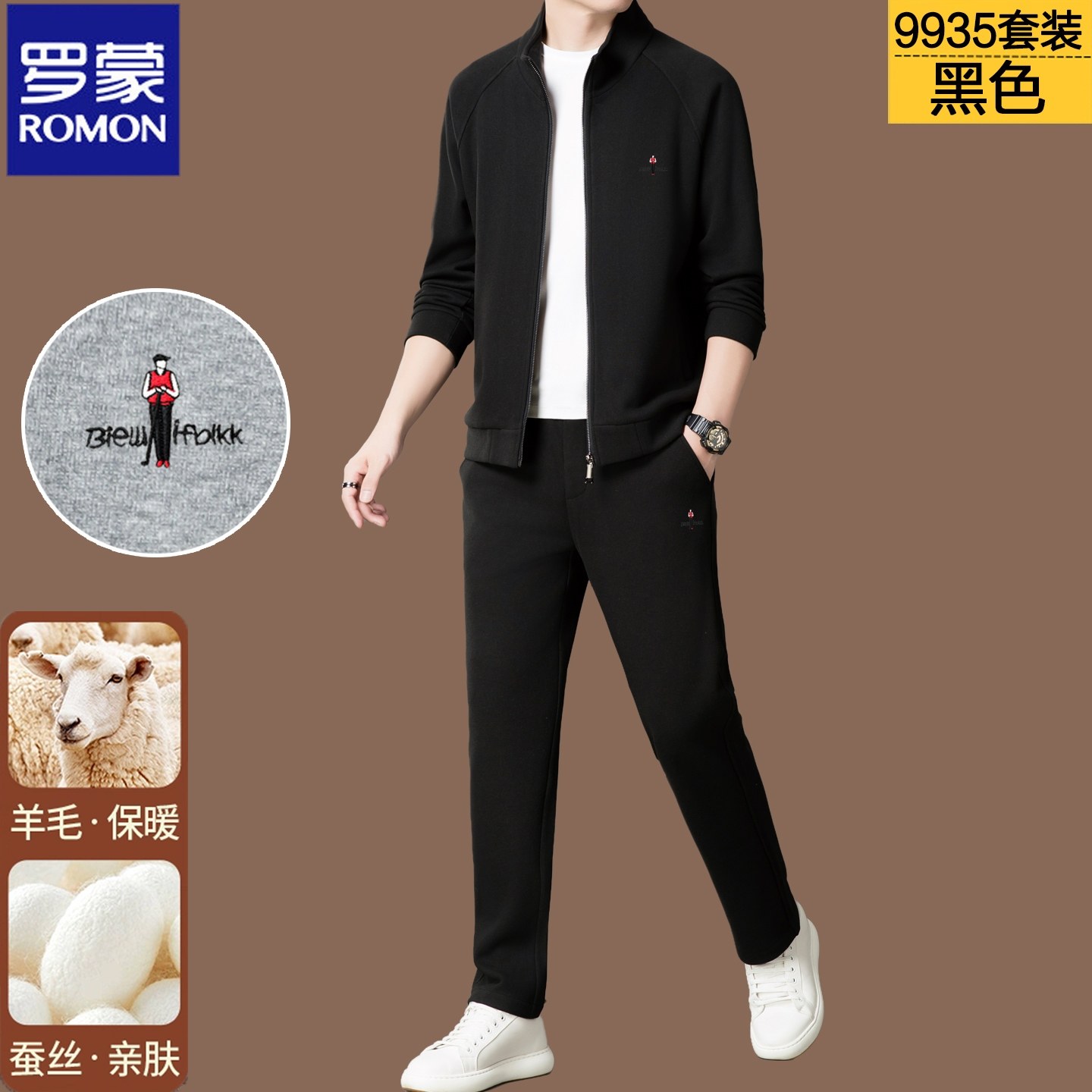 罗蒙高端运动套装男2025秋冬桑蚕丝羊毛立领外套上衣长裤两件套男