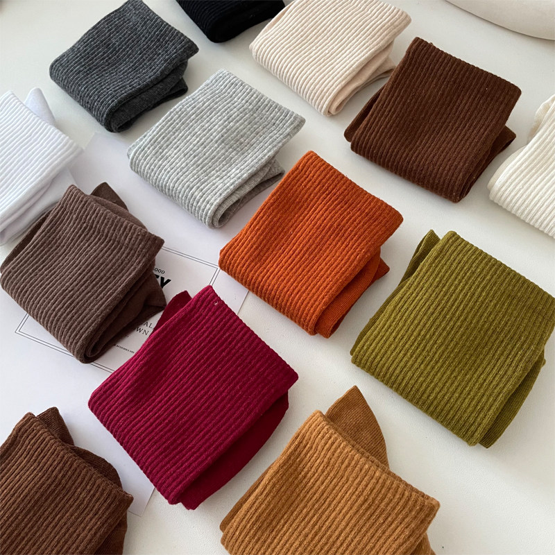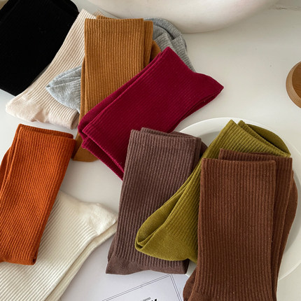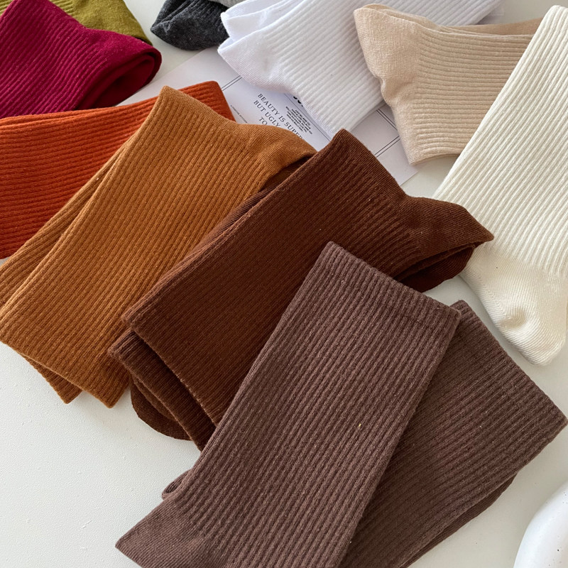 春秋季咖色袜子女中筒袜外穿搭配老爹鞋运动风细条ins潮纯色韩版