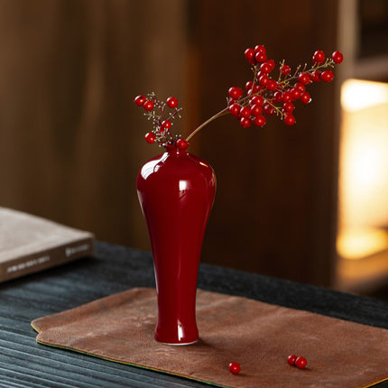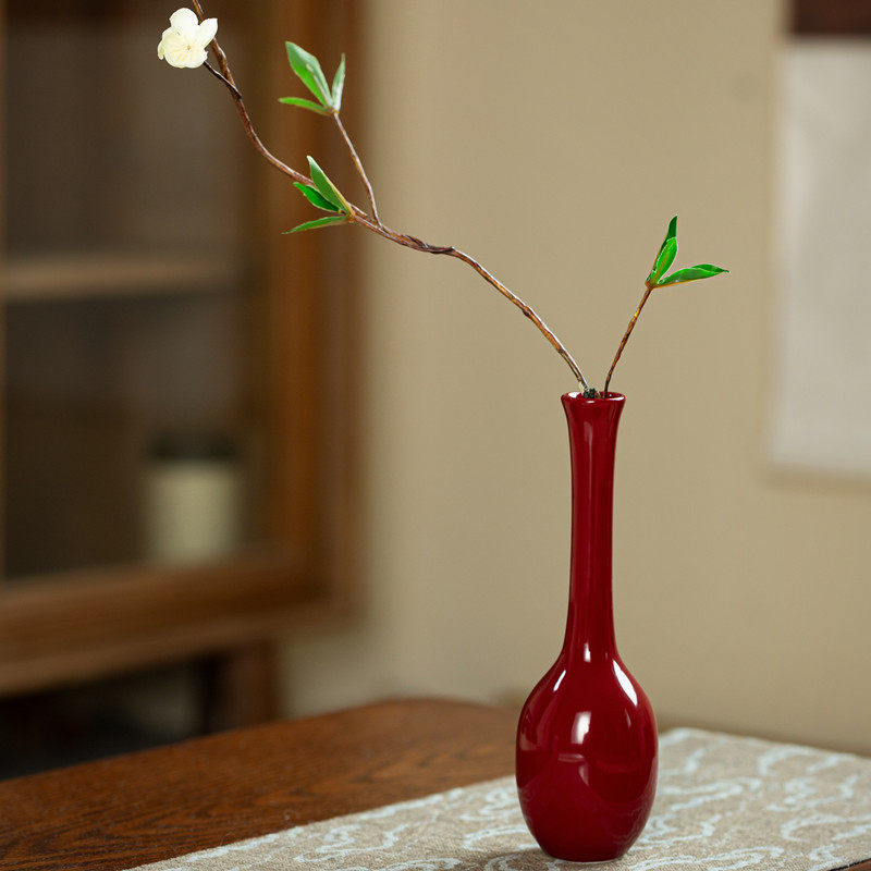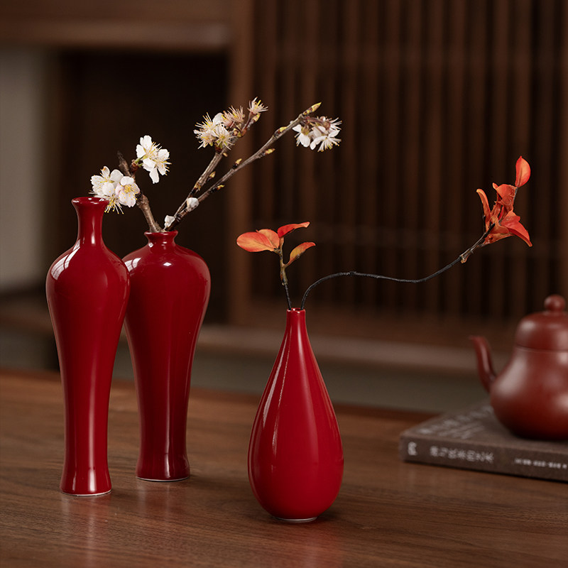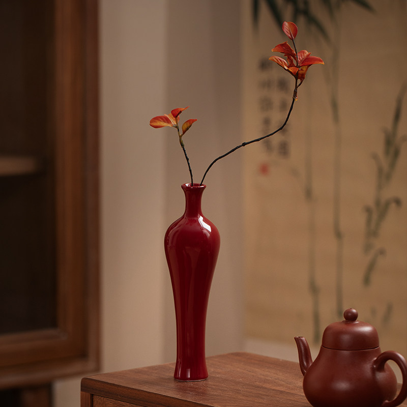 中式禅意陶瓷红色花瓶景德镇复古侘寂插花小花器桌面水培摆件饰品
