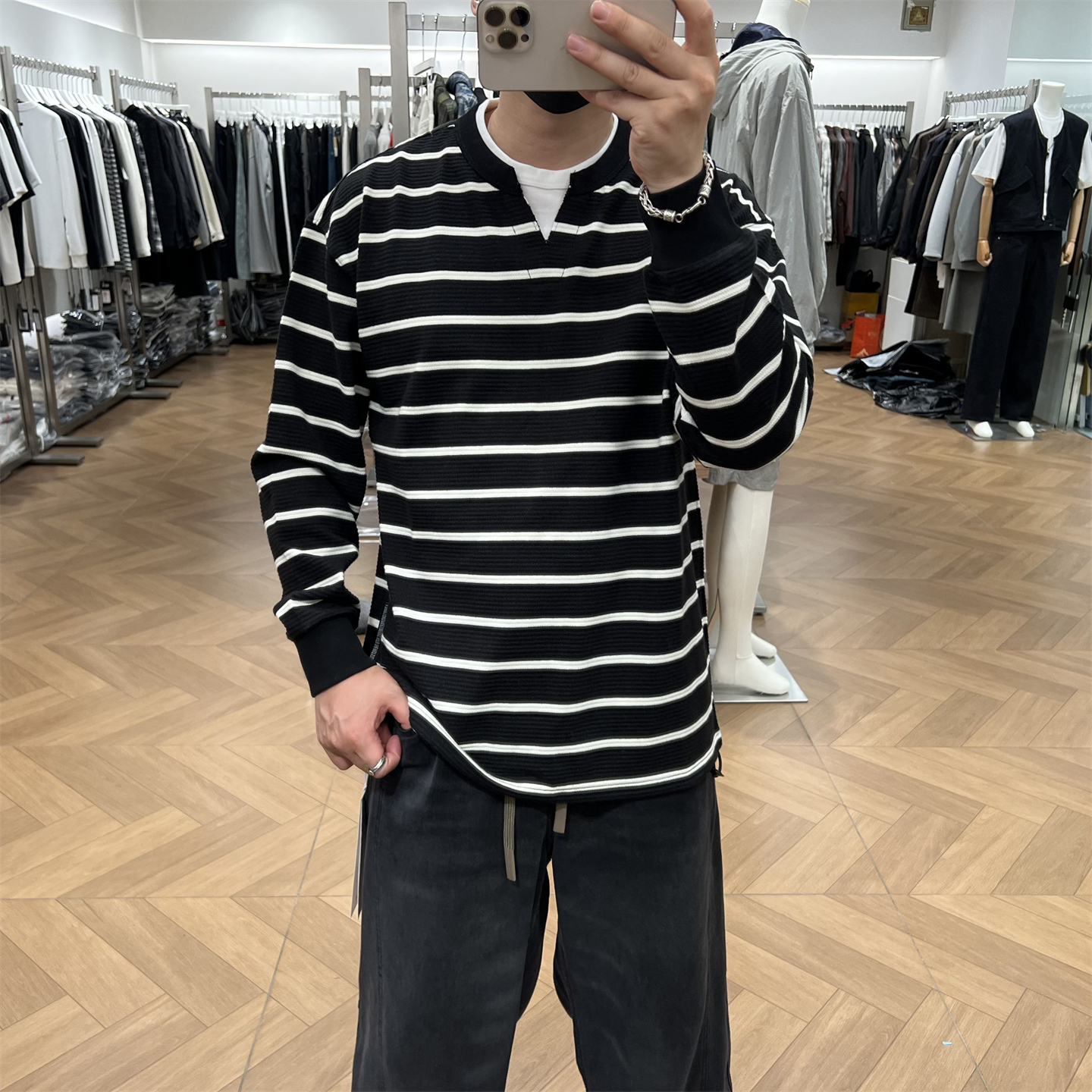 潮牌高级感假两件条纹圆领长袖T恤男士秋季美式宽松复古痞帅卫衣