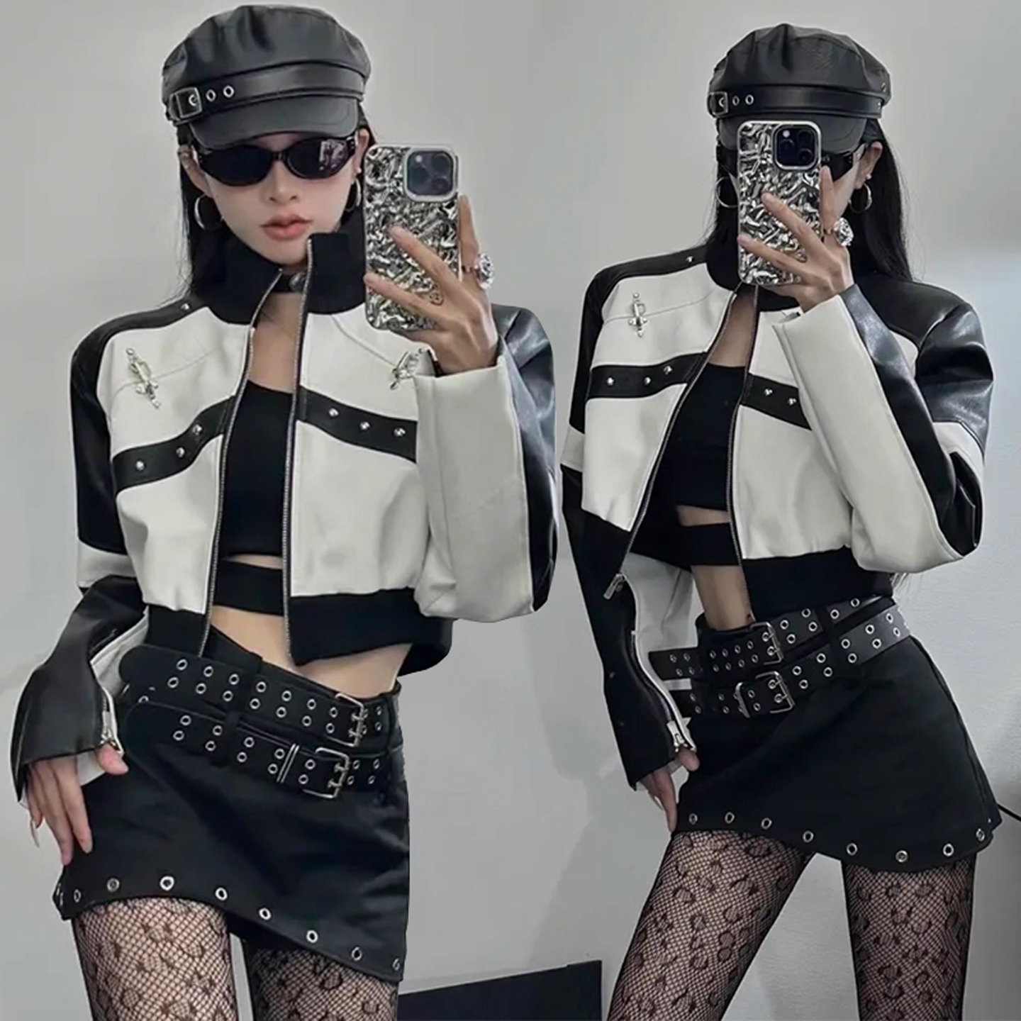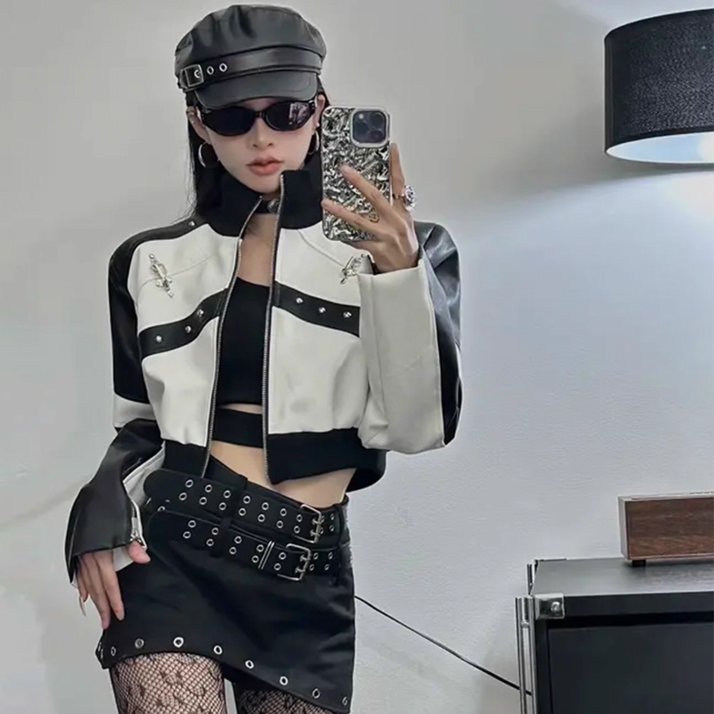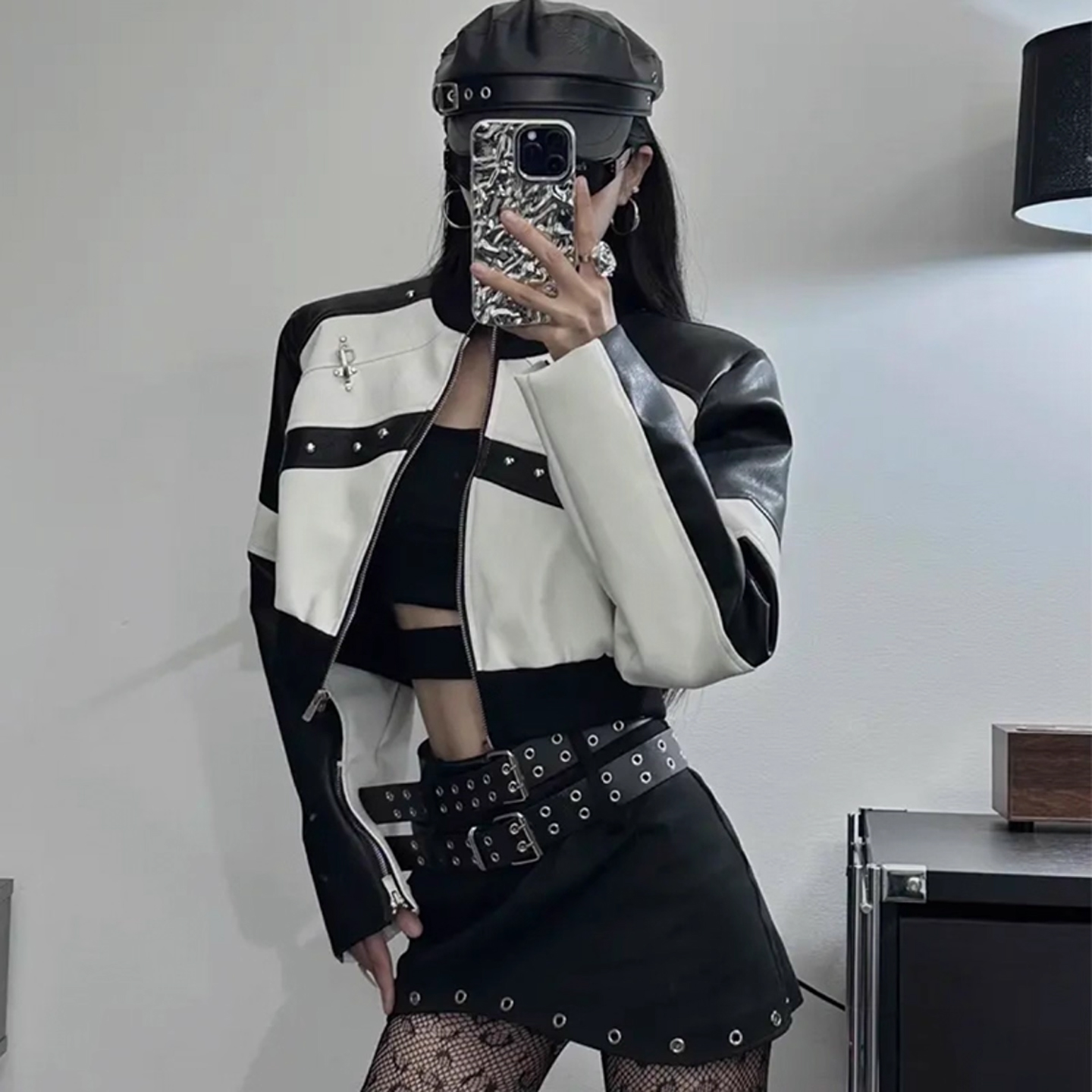 网红同款黑白撞色系扣铆钉PU皮衣外套女春秋新款酷飒风辣妹短夹克