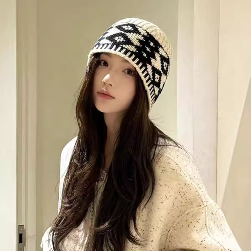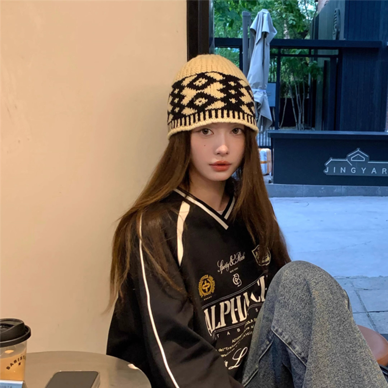 LC同款针织毛线帽女秋冬季菱形图案拼接百搭保暖冷帽时尚堆堆帽潮