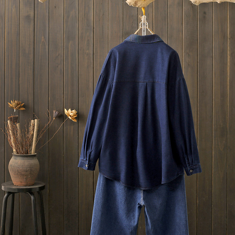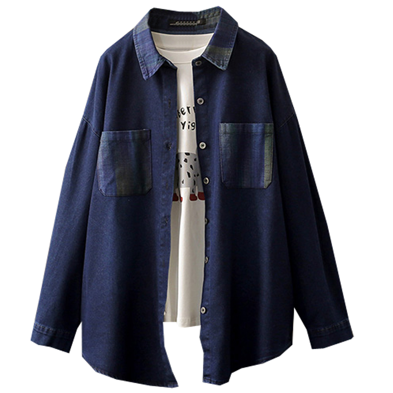 春秋大码200斤翻领复古牛仔长袖衬衫女宽松显瘦遮肚衬衣外套上衣