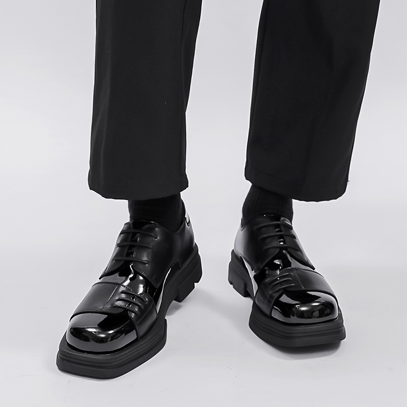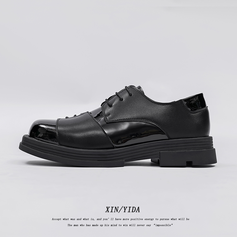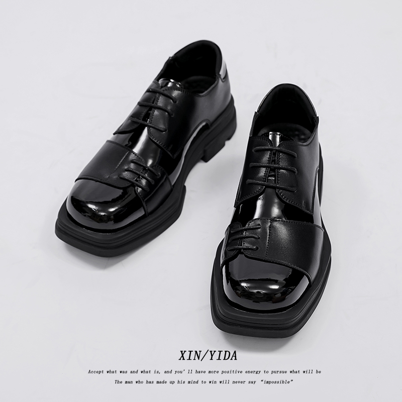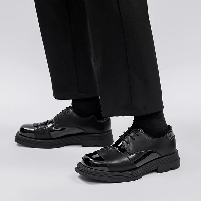 方头皮鞋男设计感小众英伦风拼接款休闲商务演出黑色增高德比鞋子