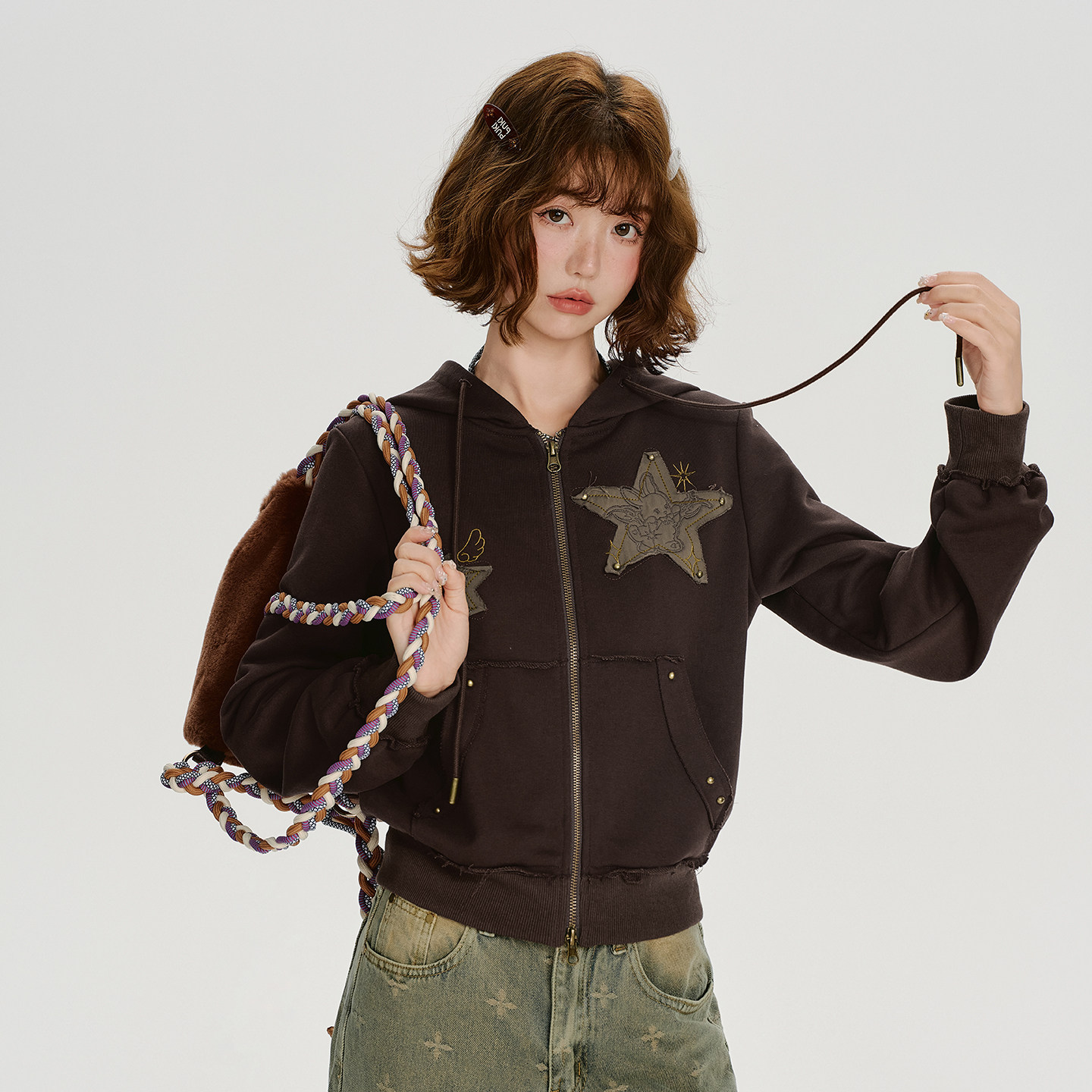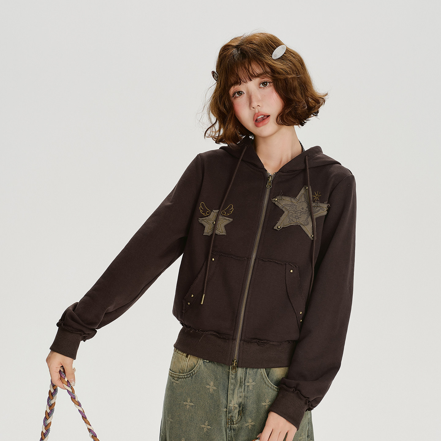 Girlyhalo美式复古贴布绣连帽卫衣外套女秋季新款设计感短款上衣