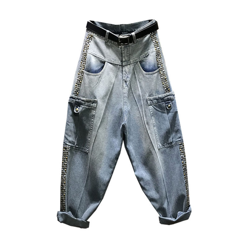 欧洲站2025秋装新款宽松大码网红个性钉珠老爹牛仔哈伦垮裤女长裤