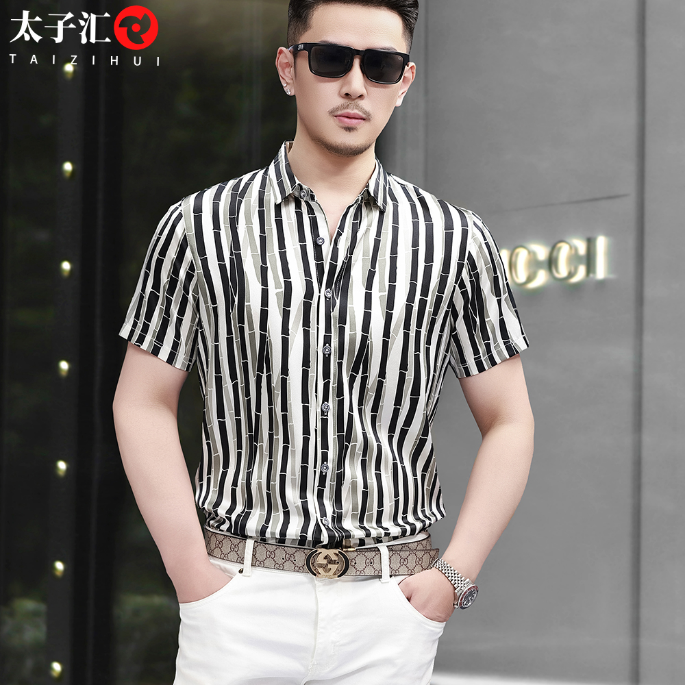 新款桑蚕丝短袖花衬衫男士夏季上衣服高级感透气高端真丝绸缎衬衣