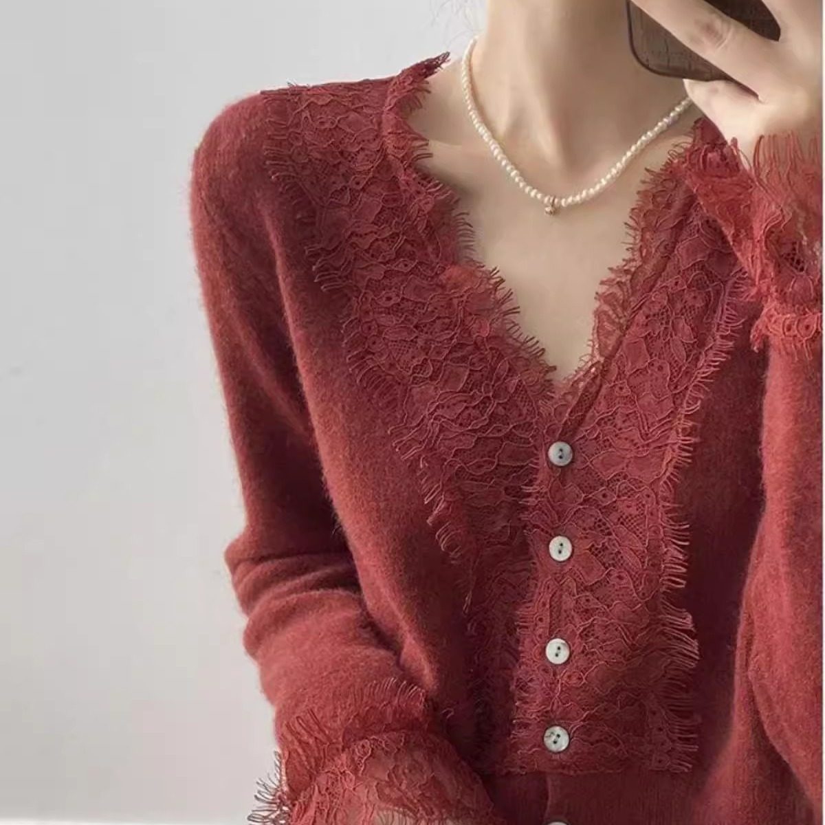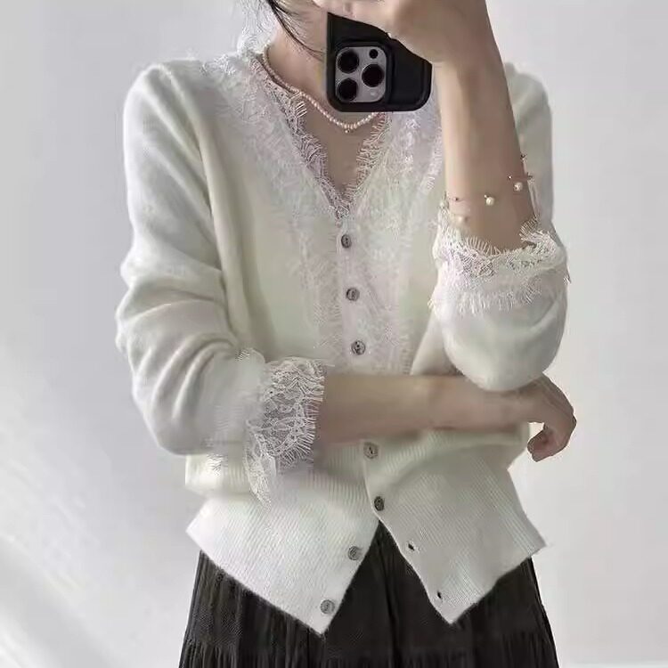 蕾丝边V领羊毛针织开衫女收腰内搭毛衣温柔风秋季长袖打底衫外套
