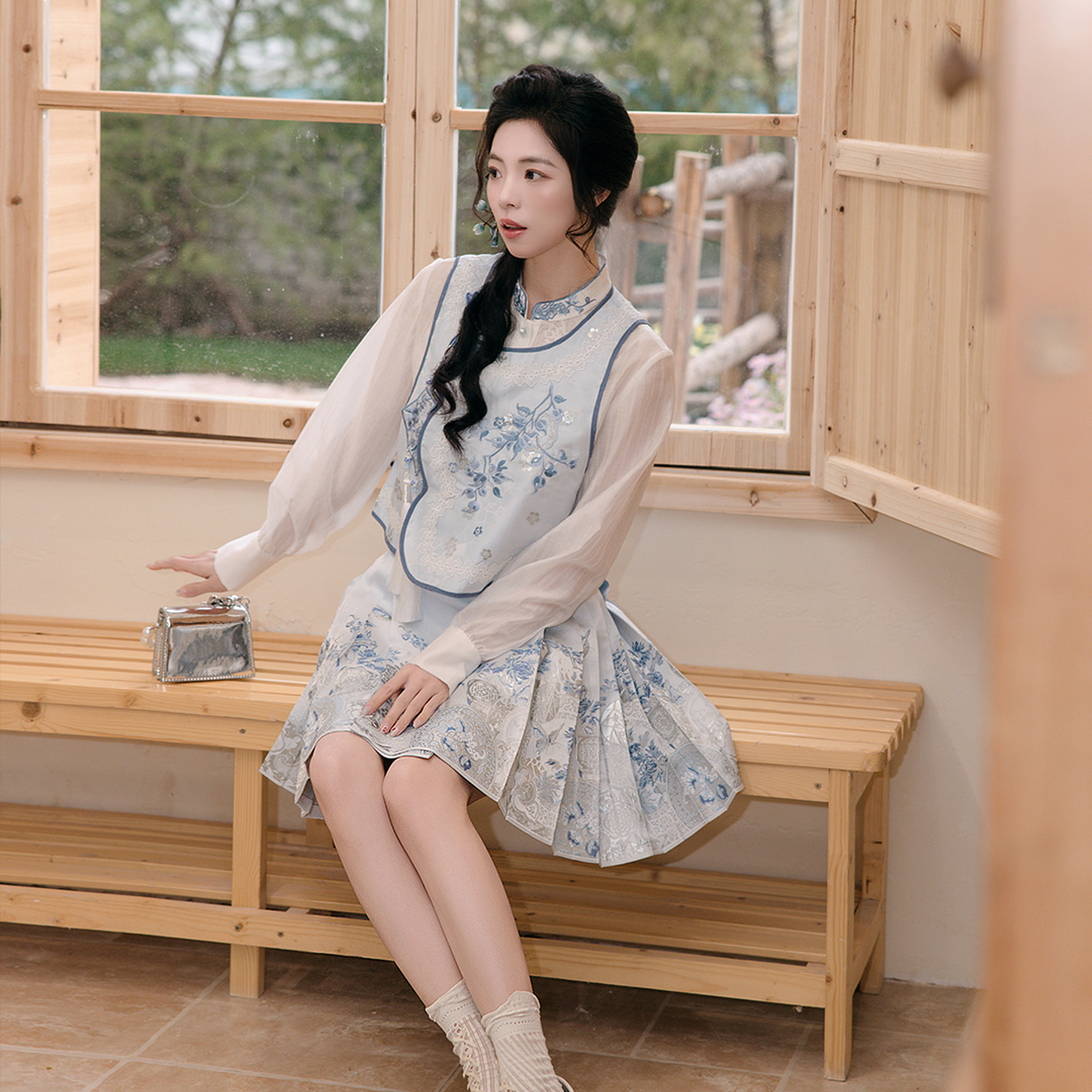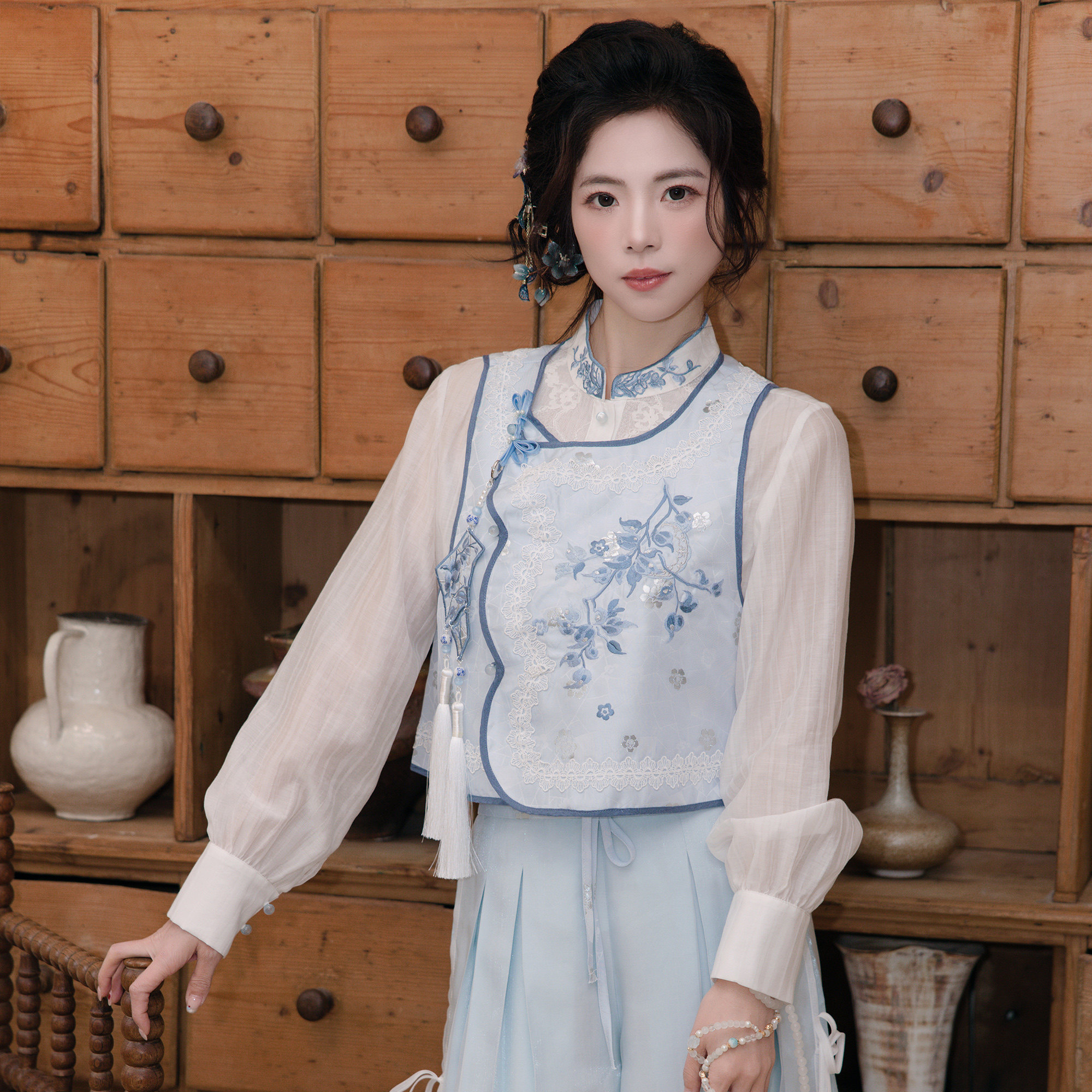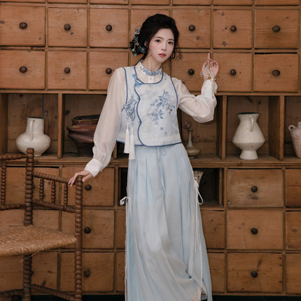造镜集【青瓷飞花】新中式改良国风衬衫短款折衷汉马面裙服套装女