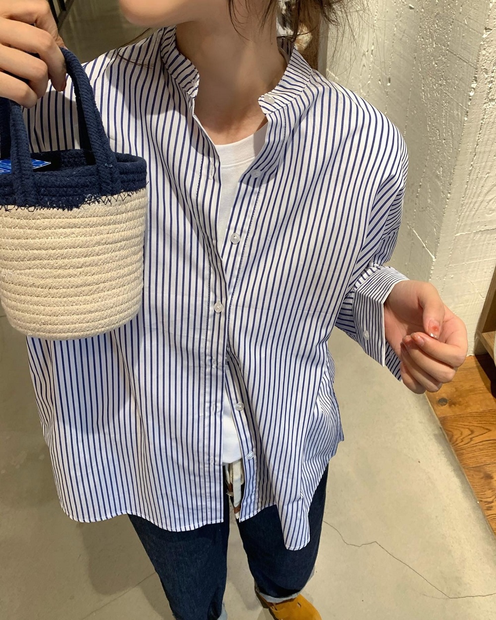 徐蹦蹦 自带少年感 日系早秋宽松立领竖条纹长袖衬衫女衬衣外套