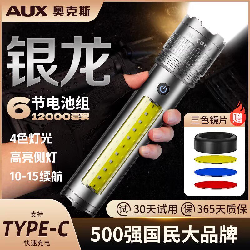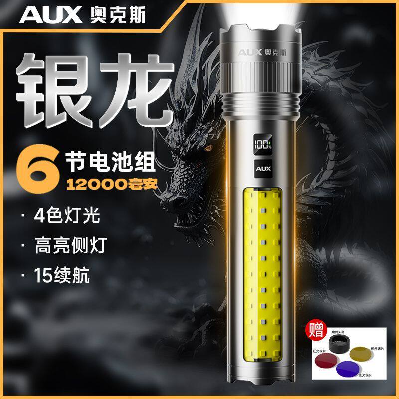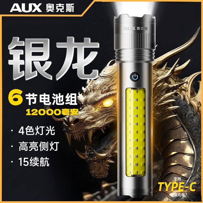 奥克斯银龙手电筒2026新款强光充电超长续航大容量远射超亮大功率