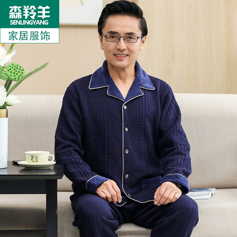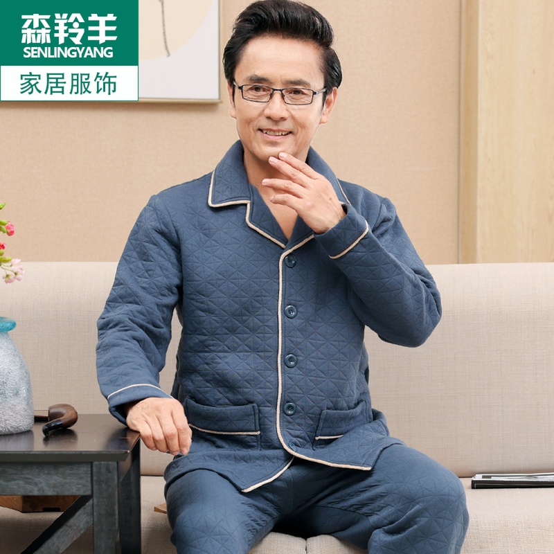 睡衣男士秋冬保暖纯棉夹层家居服可外穿中老年爸爸开衫薄夹棉套装