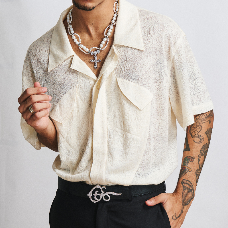 GLACIERBOY冰透提花半袖衬衫纱感夏季透气宽松薄款短袖衬衫外套男