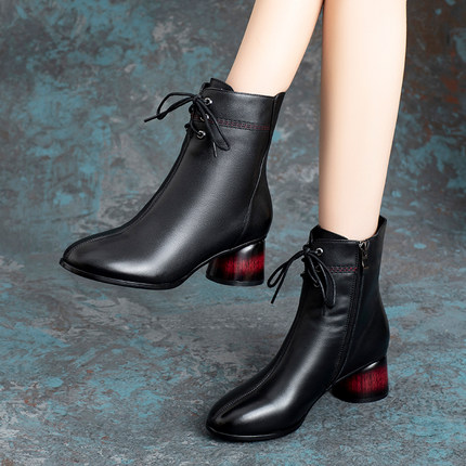 头层牛皮秋冬季中跟加绒靴子女鞋
