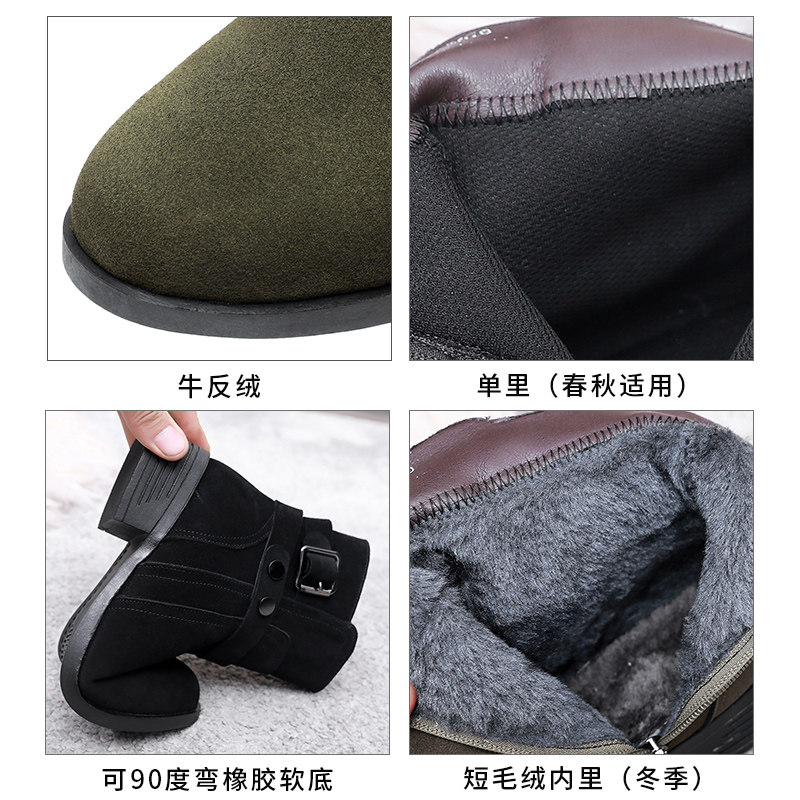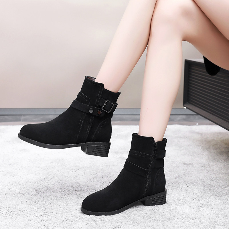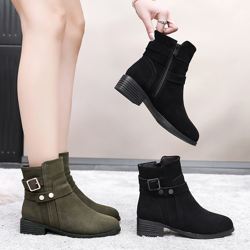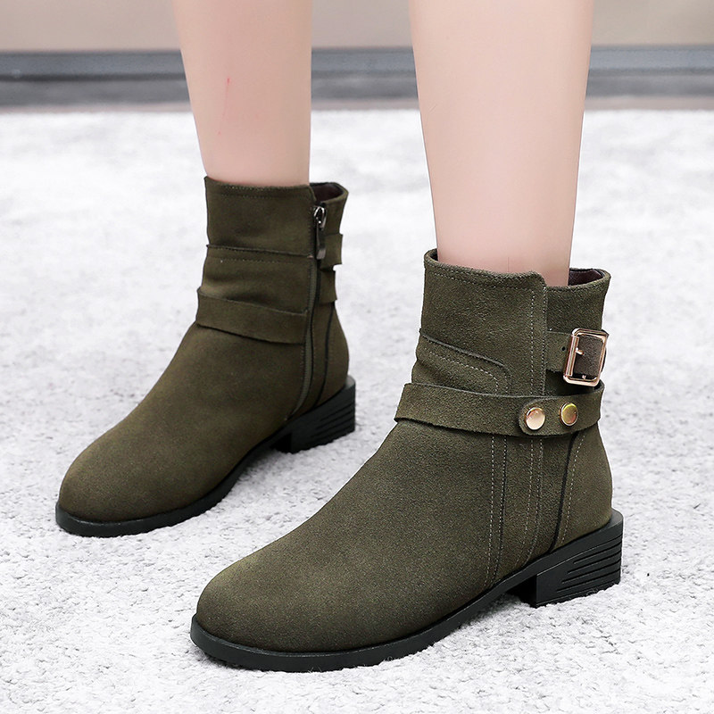 磨砂真皮粗跟短靴女中跟软底马丁靴秋冬加绒棉靴子洋气韩系小踝靴