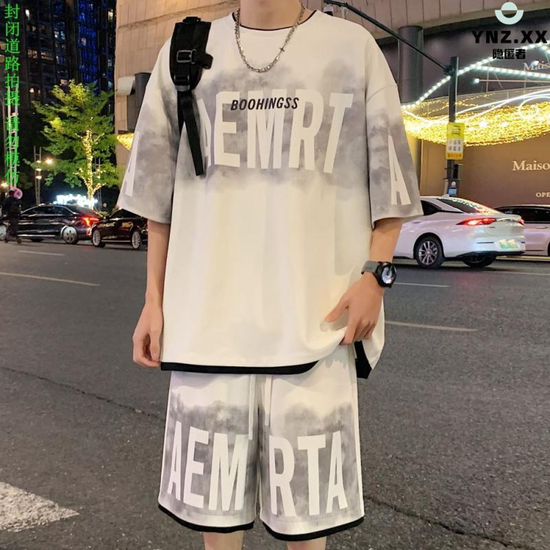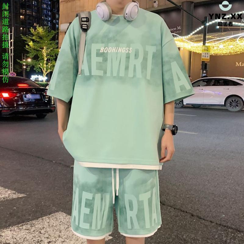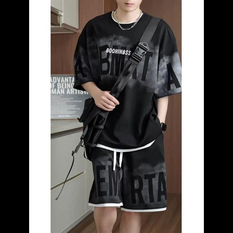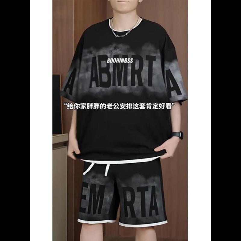 特大码300斤套装短袖t恤男夏季假两件美式复古潮牌大码半袖体恤