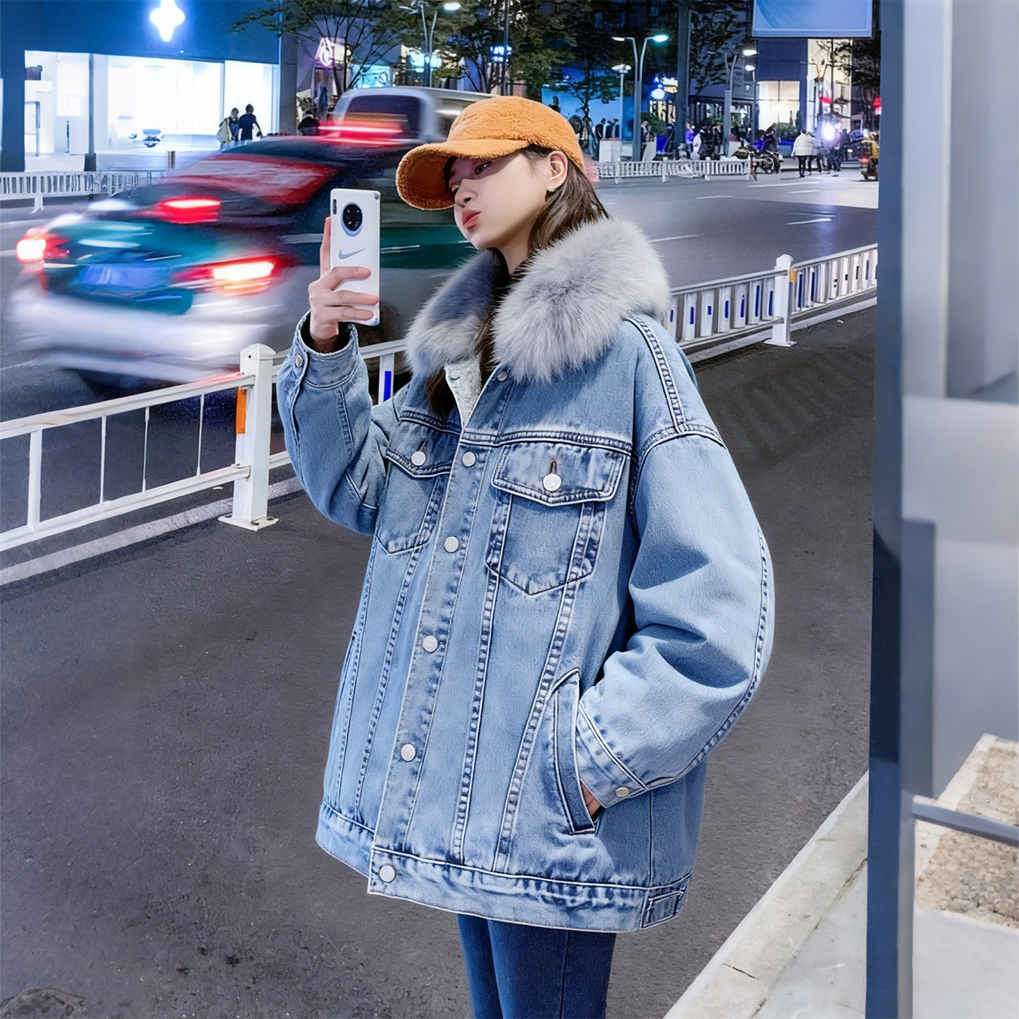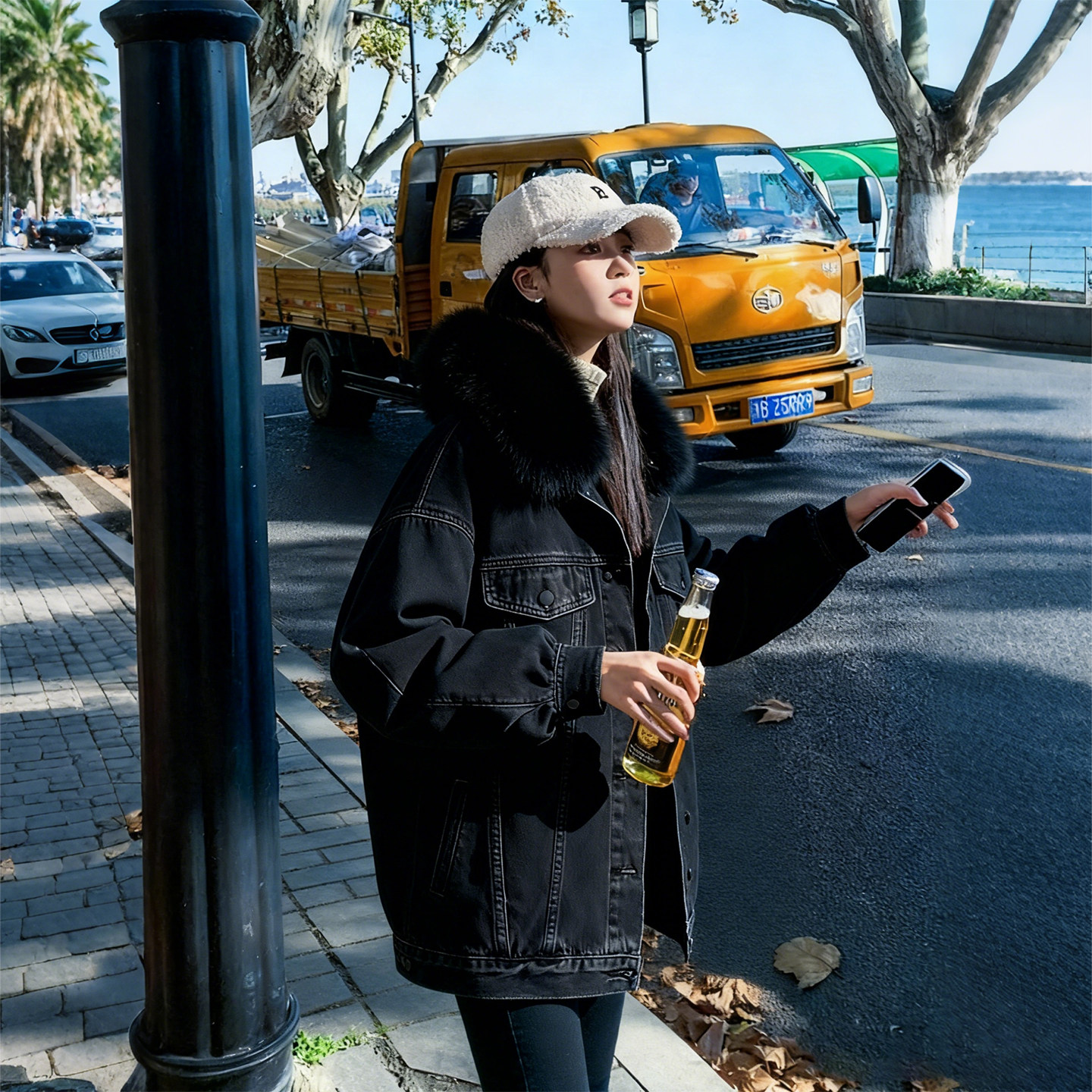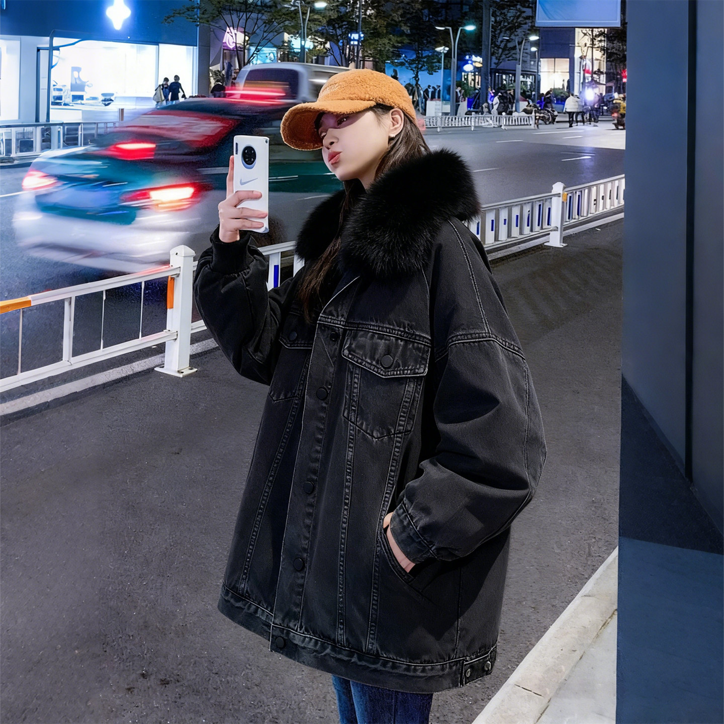 特大码女装胖mm复古大毛领牛仔棉服女加厚保暖宽松显瘦百搭外套潮