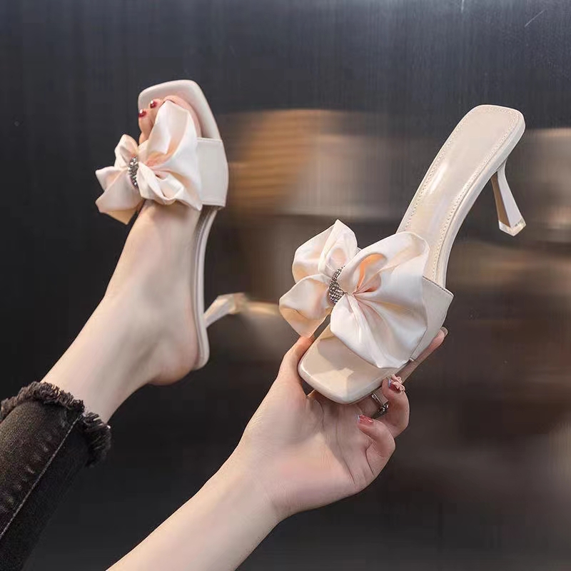 ins仙女风蝴蝶结凉拖鞋女夏外穿25新款百搭露趾一字拖高跟鞋细跟