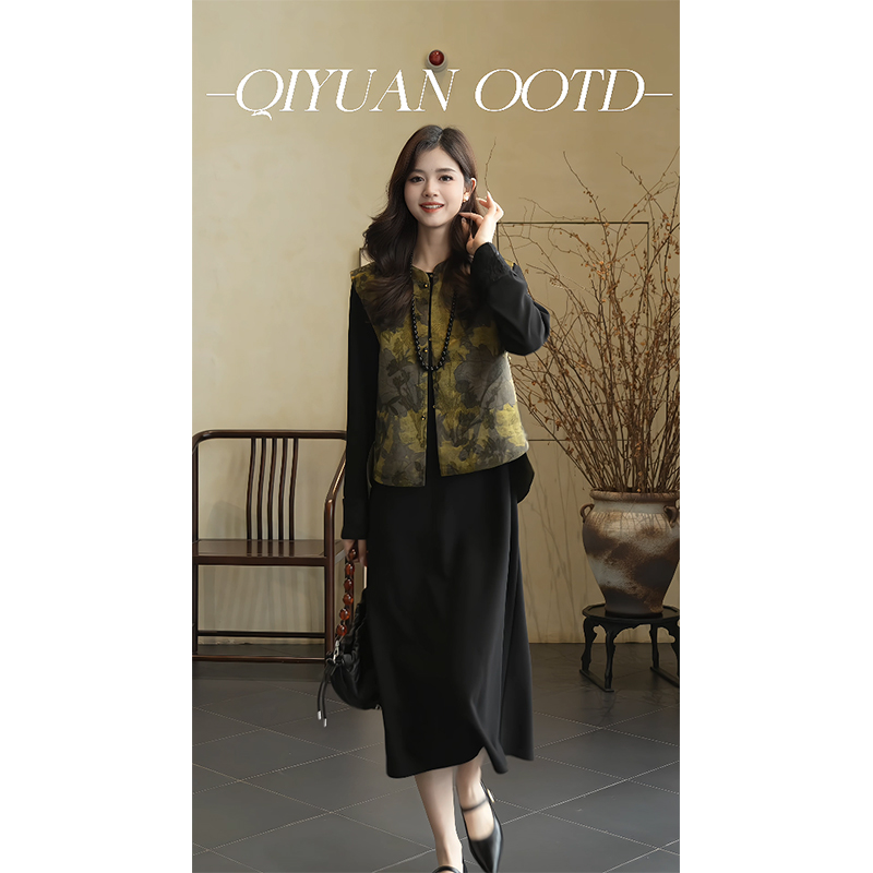 柒院家大码女装设计感国风盘扣刺绣连衣裙2025秋款宽松遮肉中长裙