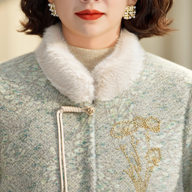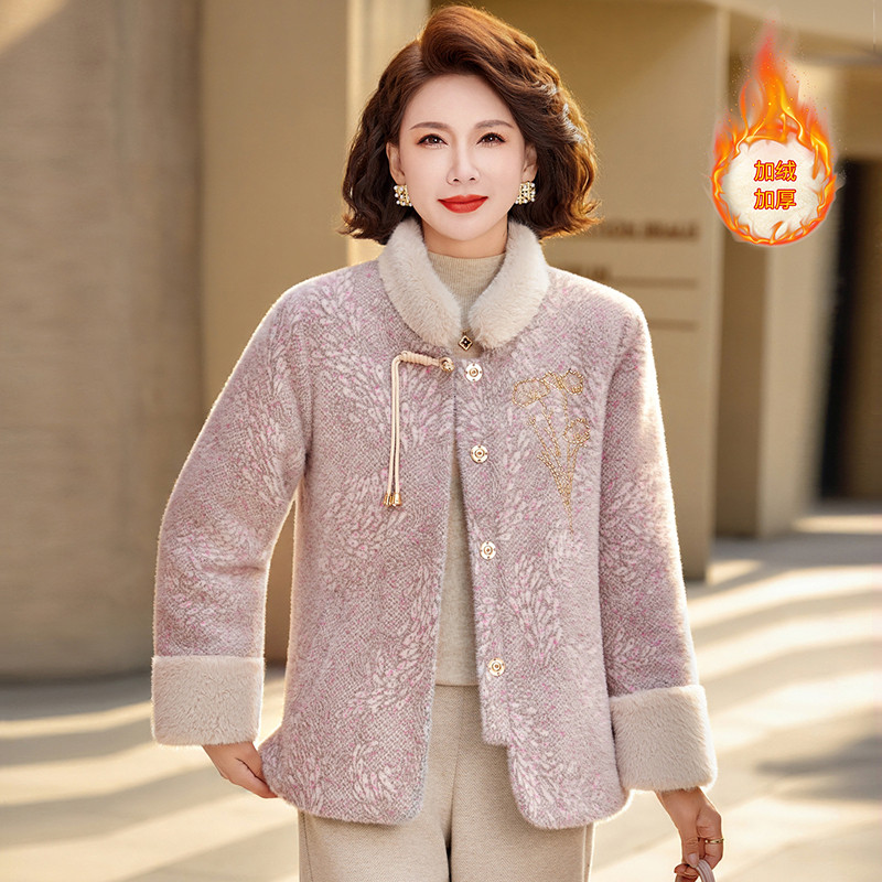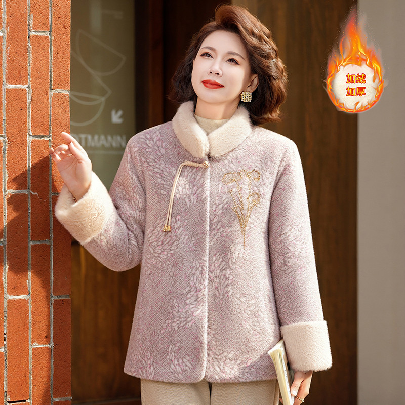 妈妈冬装仿水貂绒加厚外套中老年女款新中式国风保暖毛呢加绒上衣
