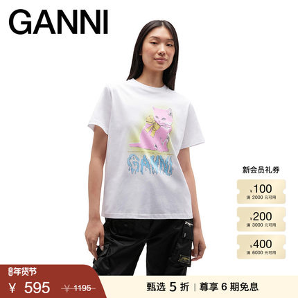 【甄选折扣】GANNI女装 优雅猫咪印花宽松短袖T恤上衣 T4339151