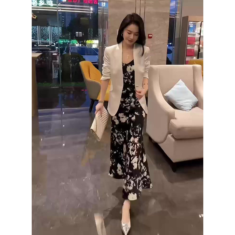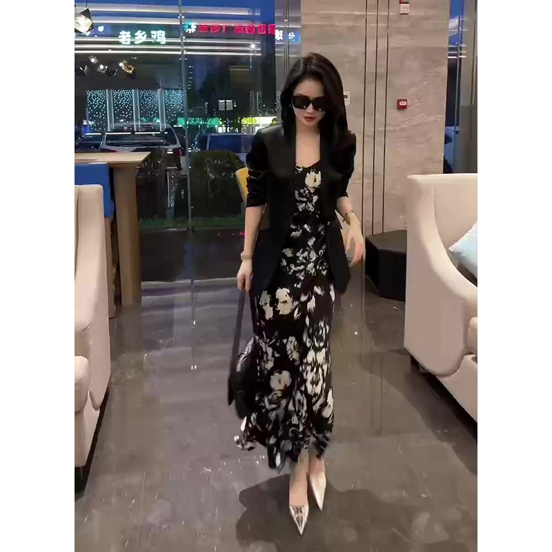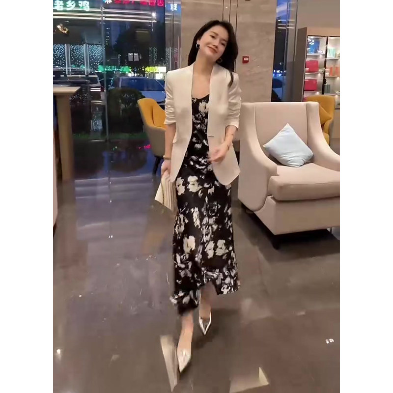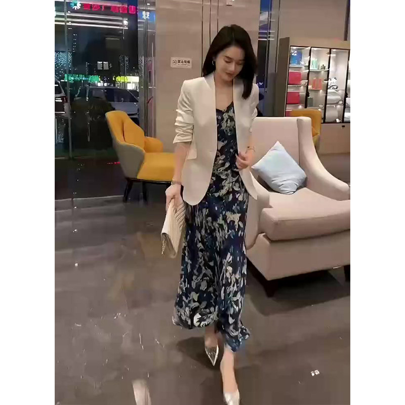 网红同款时尚两件套女春季新款碎花连衣裙显瘦遮肉西服高级感套装
