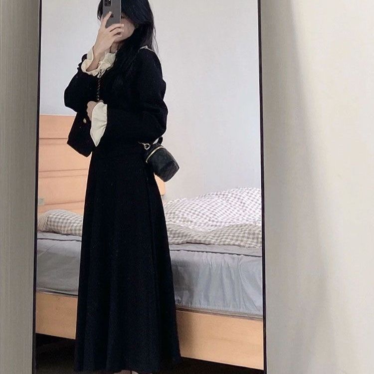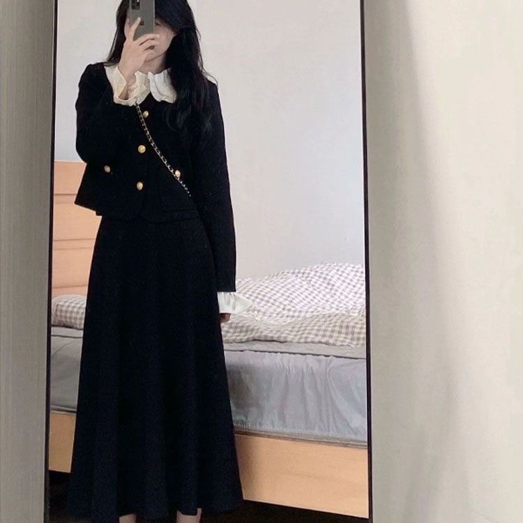 秋季新款优雅赫本小香风套装女黑白撞色假两件外套半身裙两件套潮