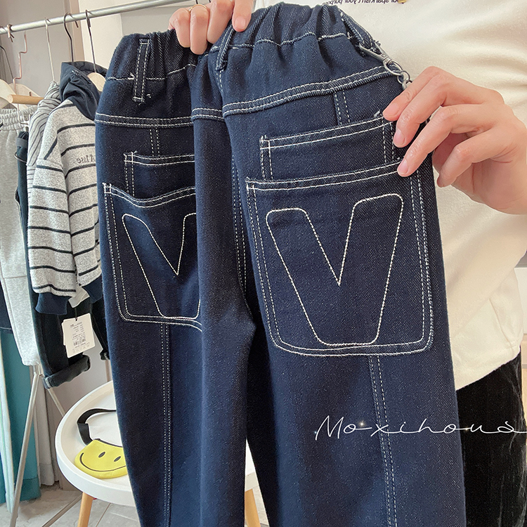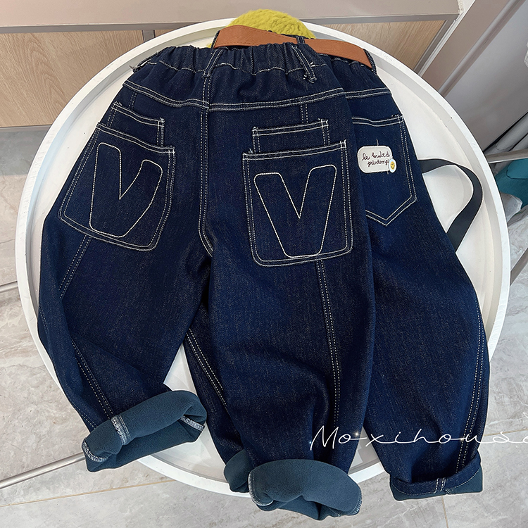 儿童秋冬加绒加厚刺绣牛仔长裤