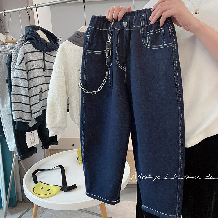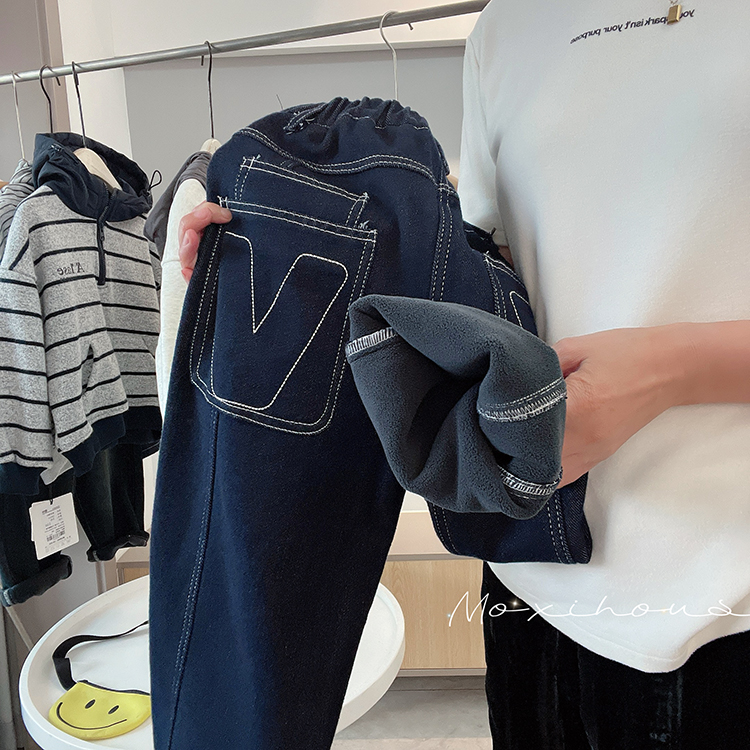 魔西深秋冬季儿童软弹中大童加绒一体绒牛仔裤原色男童帅气长裤潮