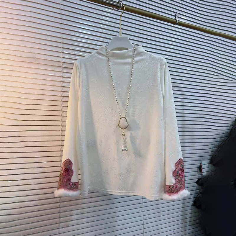 国风拉绒半高领打底衬衫大码女装冬季胖mm长袖宽松洋气显瘦上衣