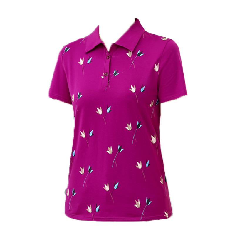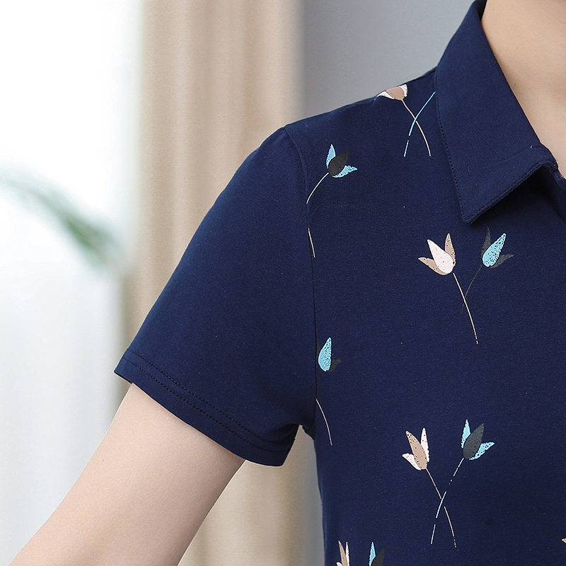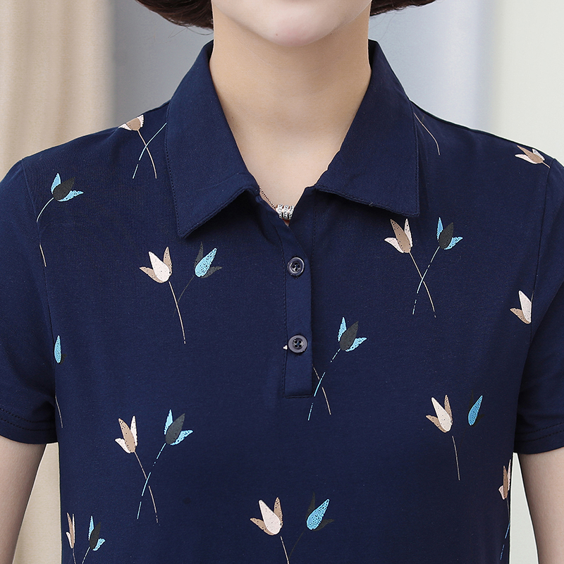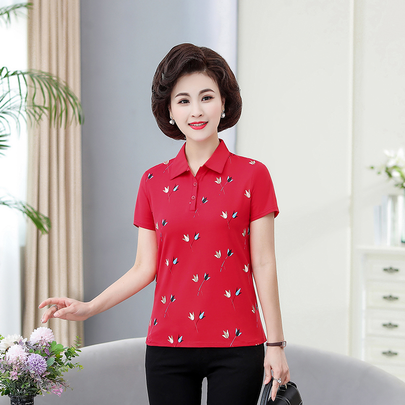 中老年女装翻领短袖t恤衫女中年妈妈装印花全棉衬衣有领上衣大码
