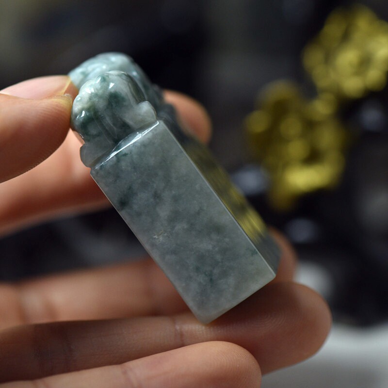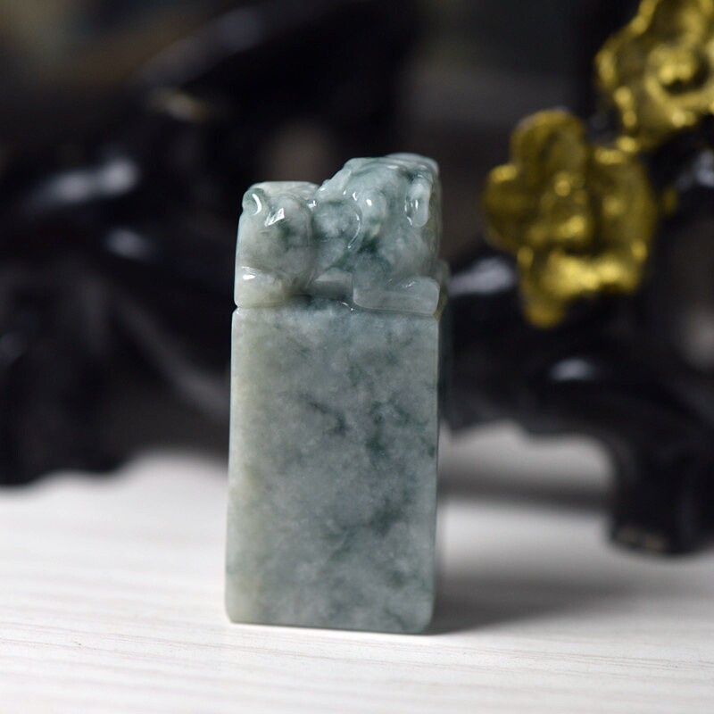 缅甸天然翡翠A货玉石貔貅印章摆件飘花玉石玉器貔貅带证书