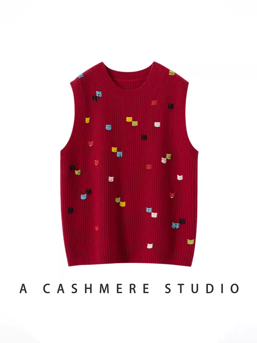 钉珠设计感山羊绒羊毛针织马甲叠穿背心宽松无袖毛衣秋冬圆领套头