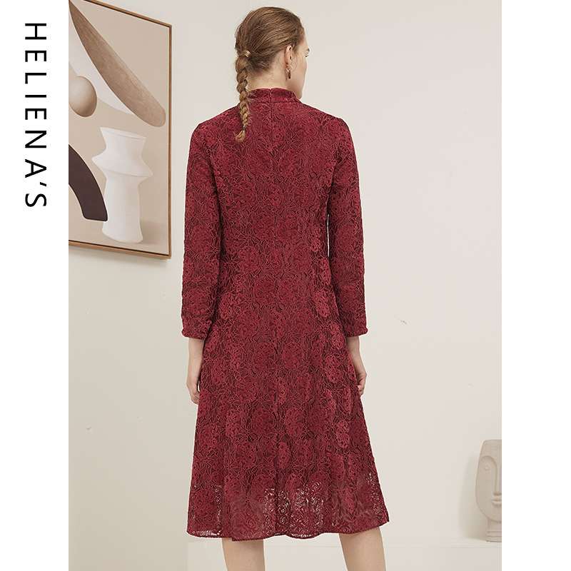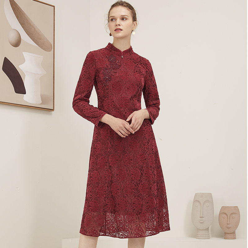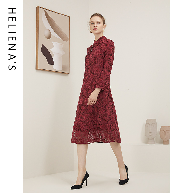 海兰丝2024秋新款商场同款淑女过膝裙气质改良旗袍红色蕾丝连衣裙