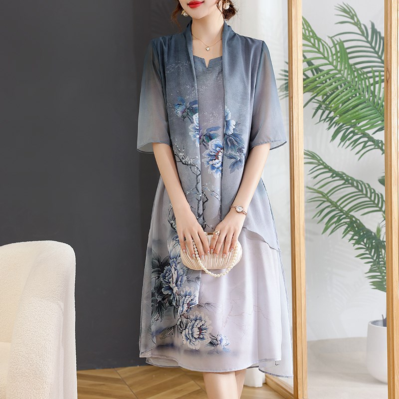 妈妈夏装2024新款改良旗袍中国风假两件真丝连衣裙高贵中老年裙子