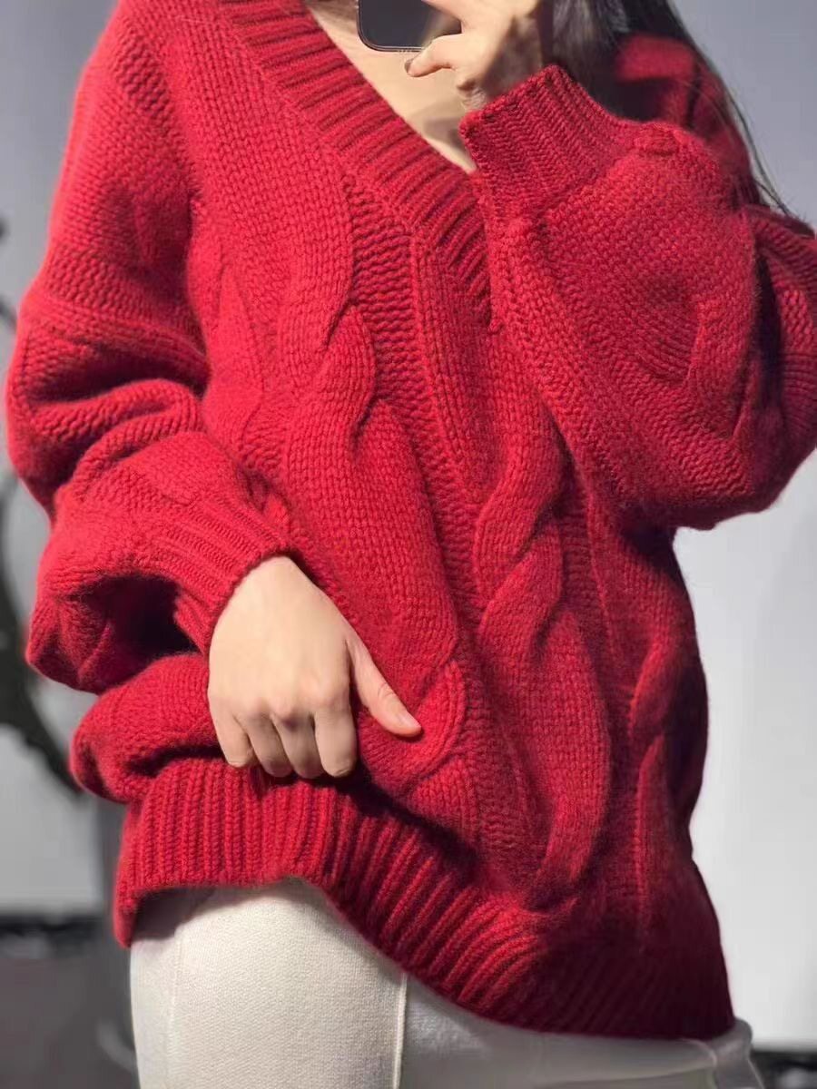 2025新款V领麻花羊毛衫女宽松泡泡袖慵懒风针织毛衣百搭显瘦上衣