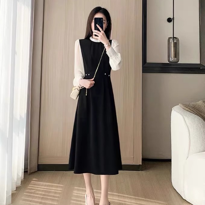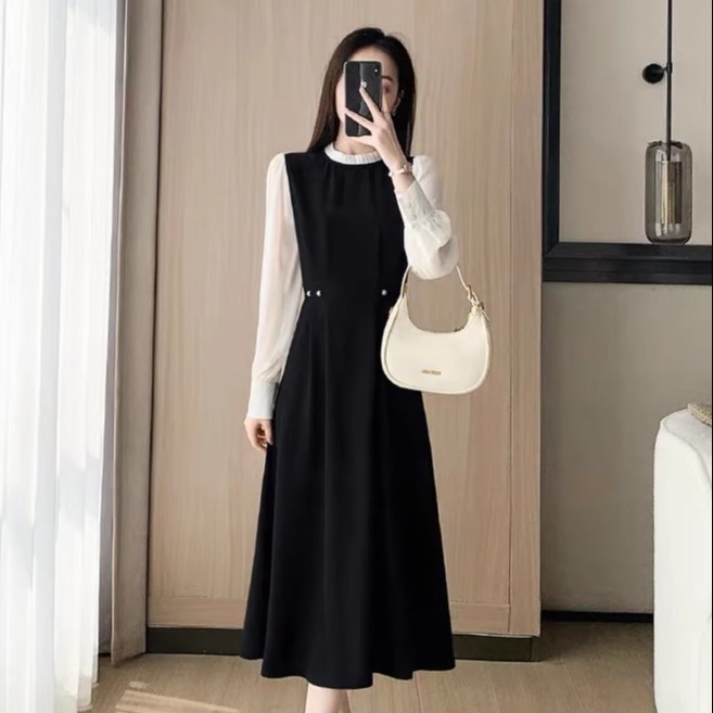 小个子法式黑色假两件连衣裙女秋2025新款修身长袖气质显瘦a字裙