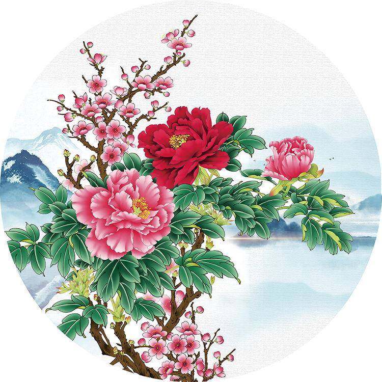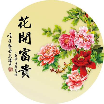 花开富贵牡丹图新中式无框圆形牡丹贴画客厅玄关餐厅装饰墙自粘画