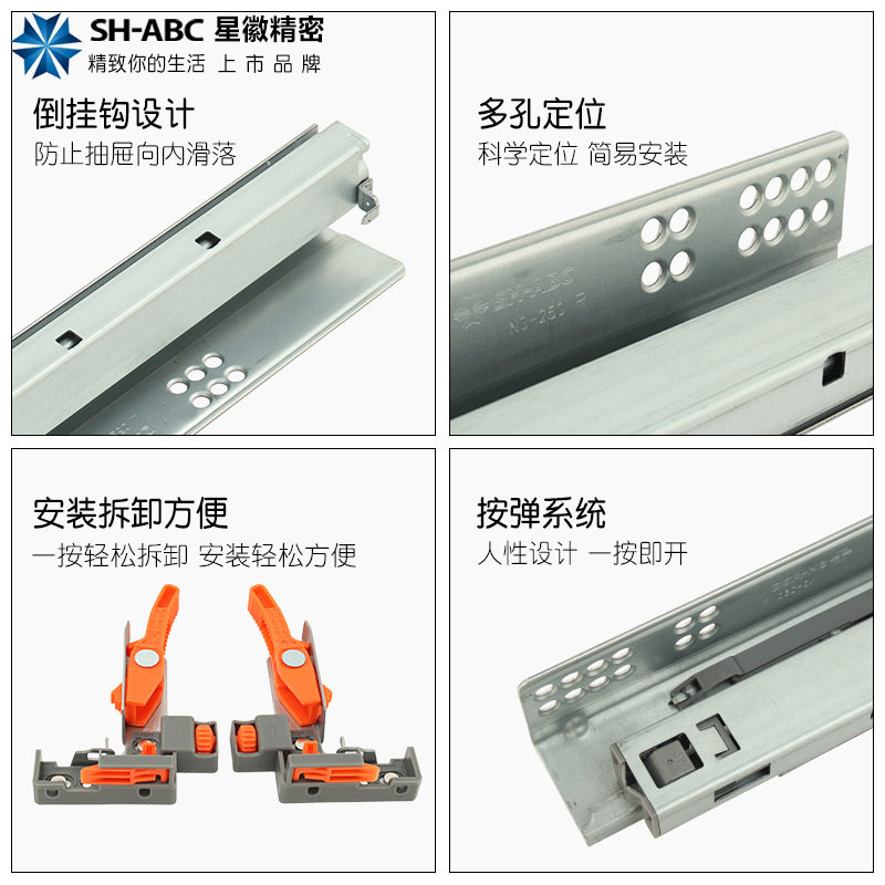 星徽SH-ABC抽屉托底缓冲隐藏式滑轨全拉出三节静音阻尼托底轨导轨