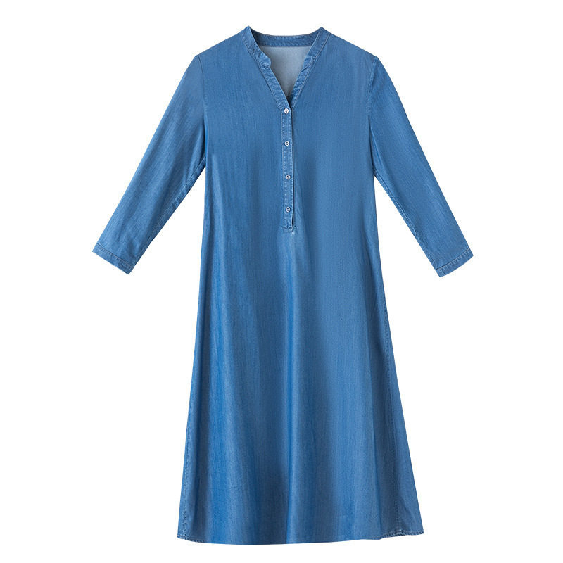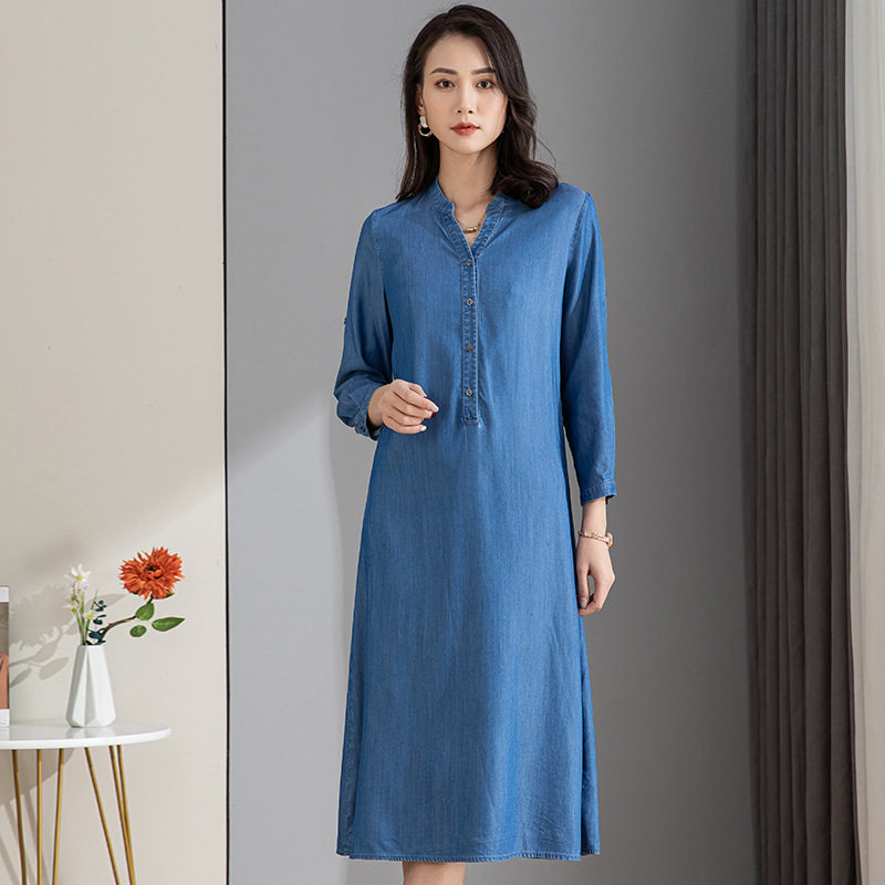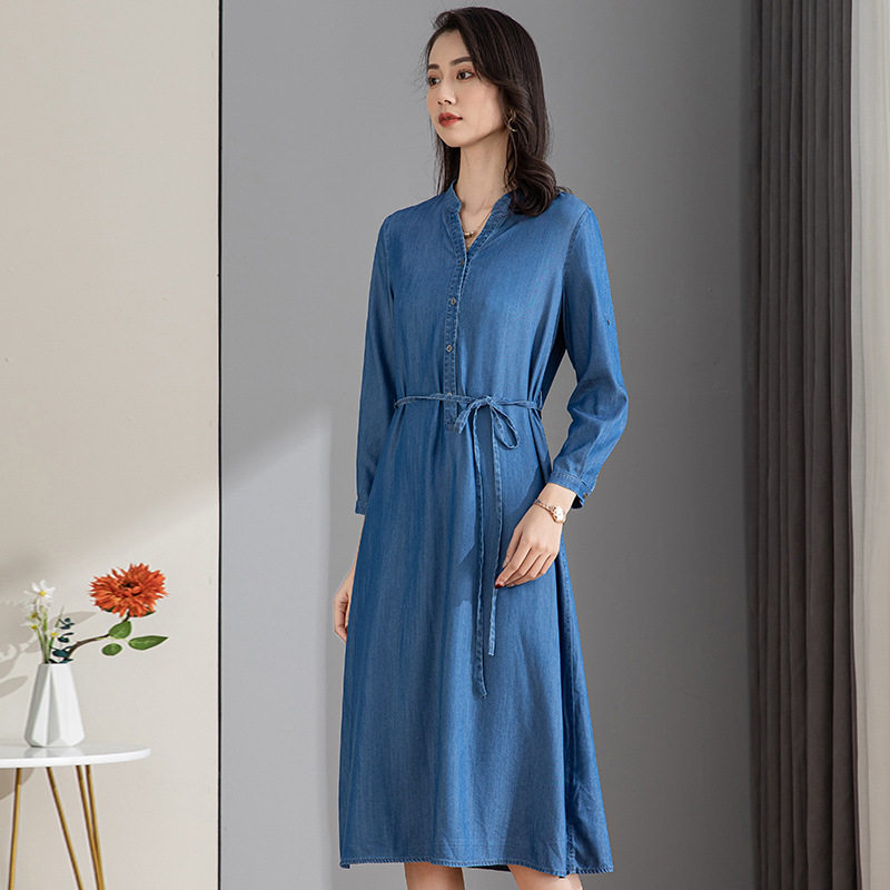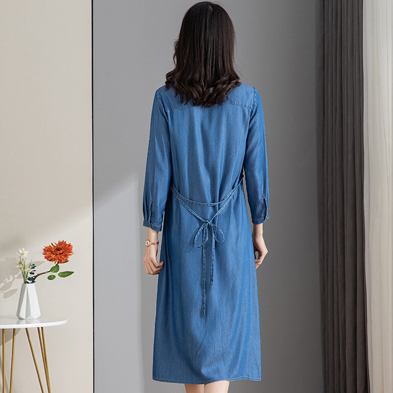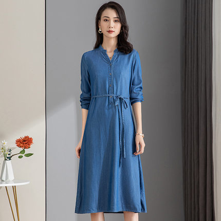 莱赛尔天丝牛仔裙春秋新款女士长袖衬衣裙中长款系带显瘦连衣裙