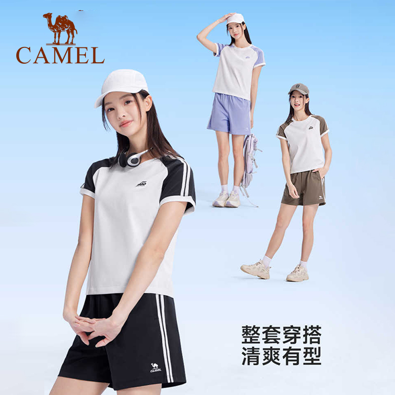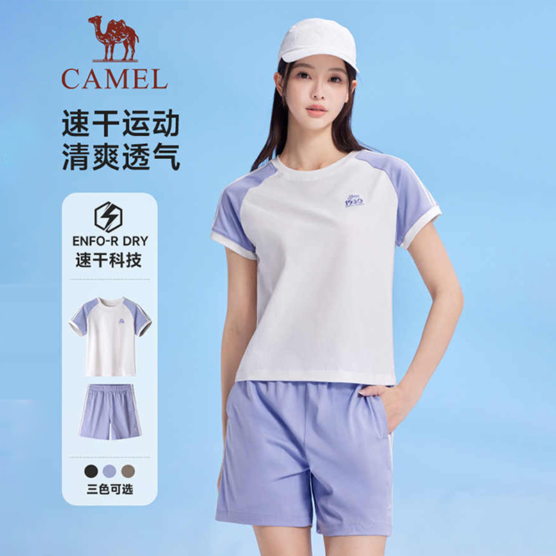 骆驼女装时尚运动套装夏季新款跑步速干短袖T恤运动短裤两件套