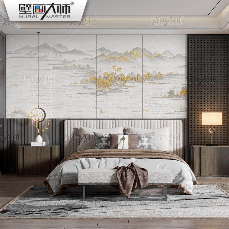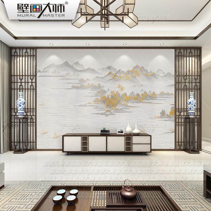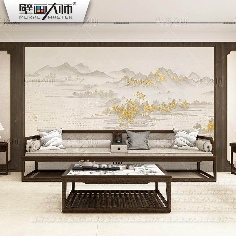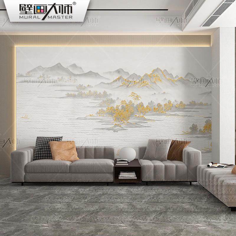 大气轻奢新中式客厅山水壁布饭店餐厅装修墙布背景墙壁画硬包壁纸