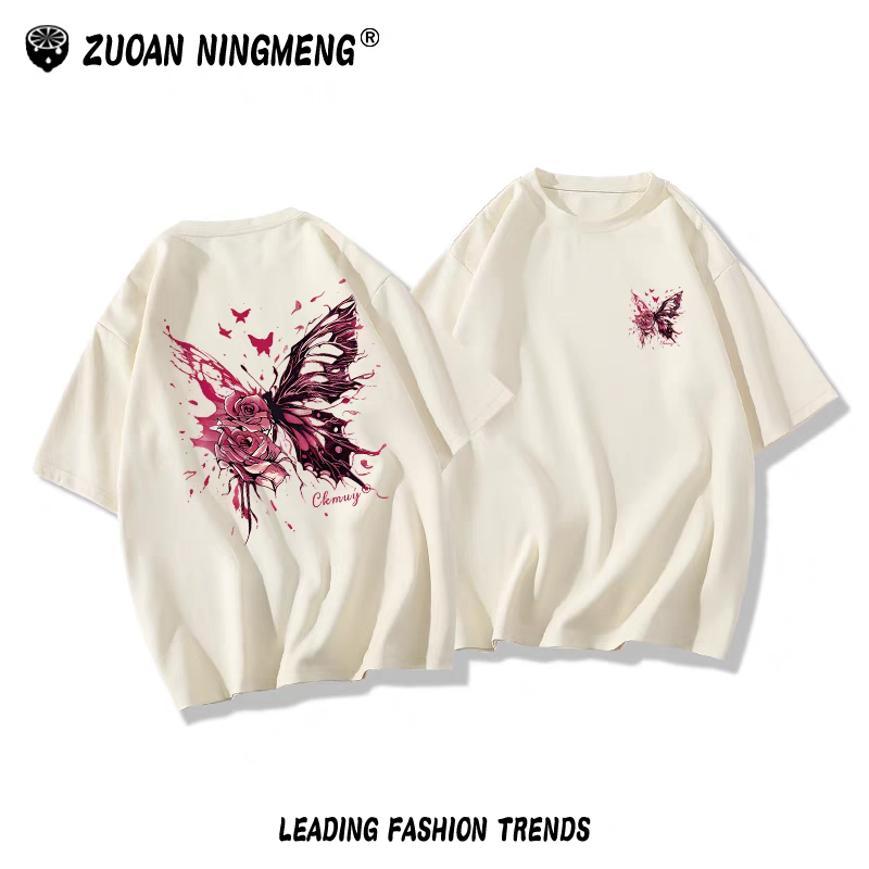女童蝴蝶印花白色短袖t恤夏季中大童纯棉2025新款宽松体恤上衣潮