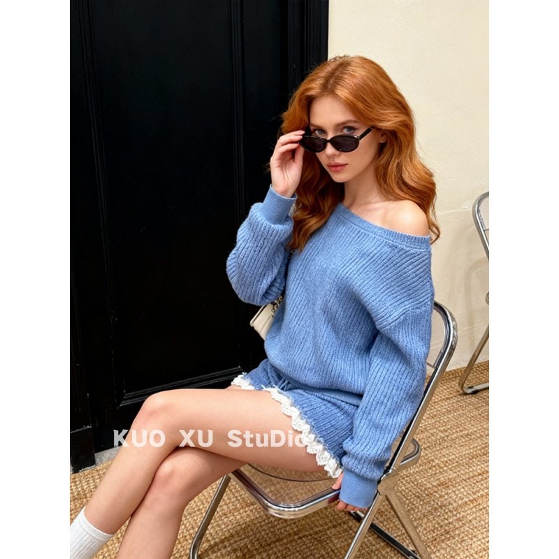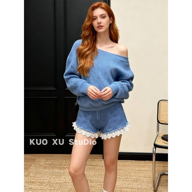 秋冬穿搭美式一字肩针织衫毛衣套头上衣高腰休闲裤蕾丝短裤套装女