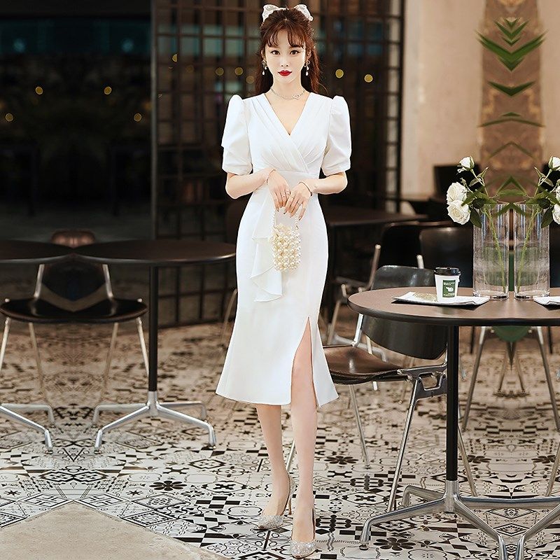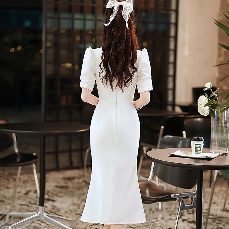 白色法式小晚礼服平时可穿小众高端气质v领中长款修身鱼尾连衣裙