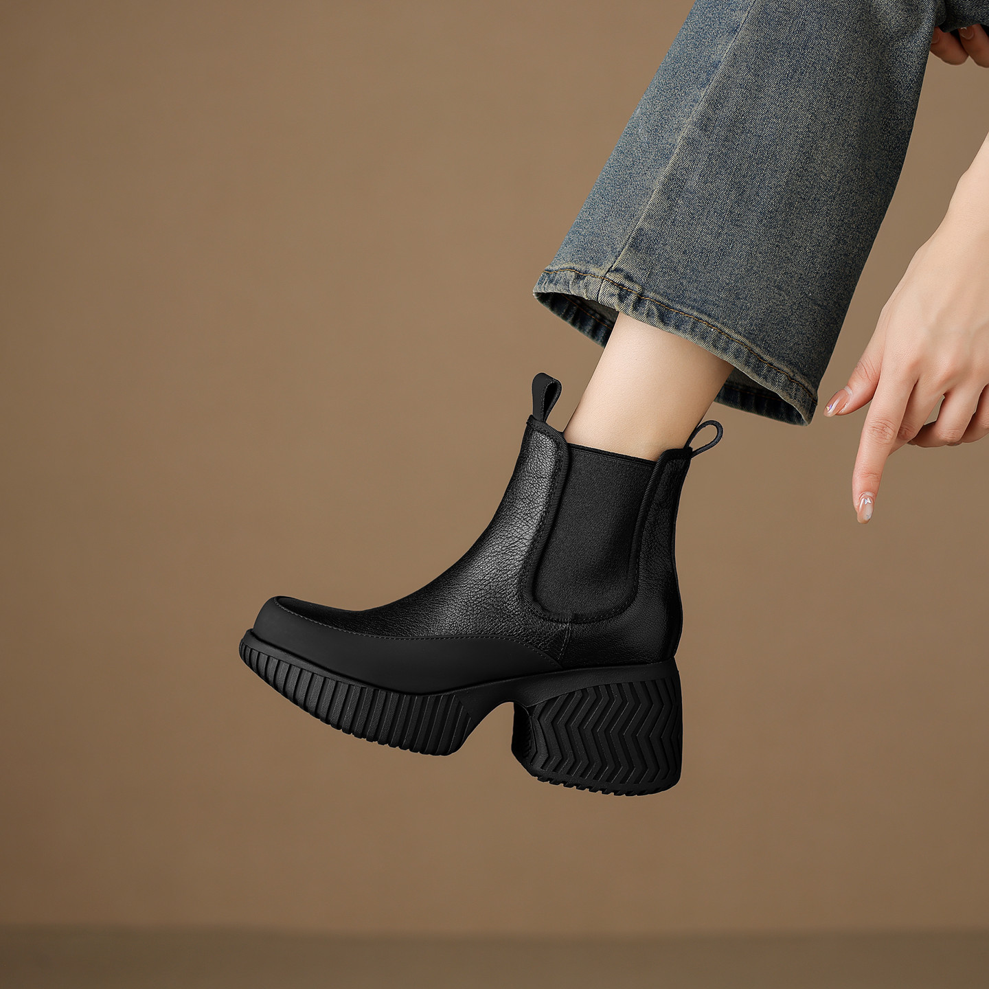 切尔西靴女真皮厚底松紧带复古马丁靴高跟防水台圆头粗跟显瘦短靴
