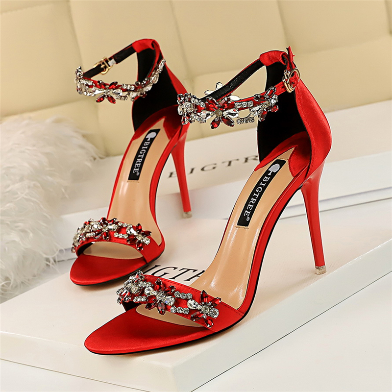 欧美风性感宴会高跟鞋女细跟晚礼服鞋绸缎露趾闪亮水钻一字带凉鞋