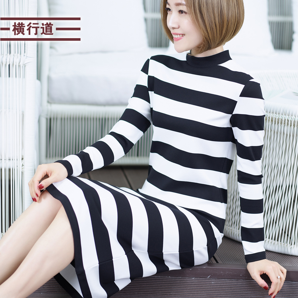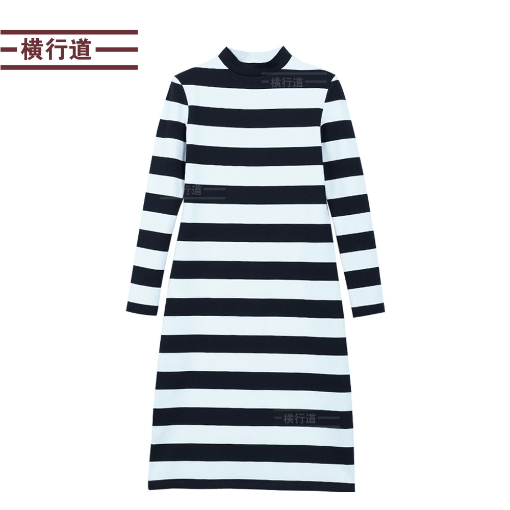 冬装新款女装加厚一步裙半高领条纹连衣裙中长款包臀裙子长袖长裙